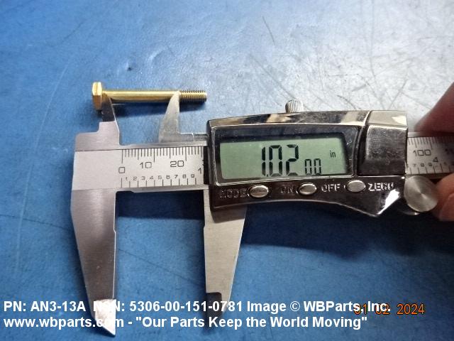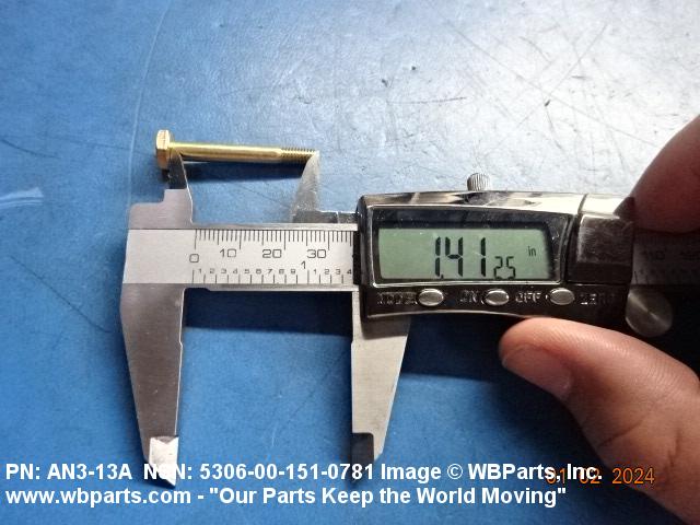 5306-00-151-0781 An externally threaded fastener designed for insertion through holes in assembled parts and normally intended to be tightened or released by torquing a nut. The threaded and unthreaded portions are both of one nominal diameter of 0.190 inch (5 mm) or larger. The head is not designed to be held or driven with an inserted driver or by the thumb and fingers. A locking feature may be incorporated in the design of the head or threads. Head dimensions and sizes of threaded and unthreaded portions shall conform to internationally recognized fastener standards. For items having a grip length portion machined to a tolerance of 0.0015 inch (0.038 mm) or less, BOLT, SHEAR. See also SCREW, CAP, HEXAGON HEAD and SCREW, MACHINE.