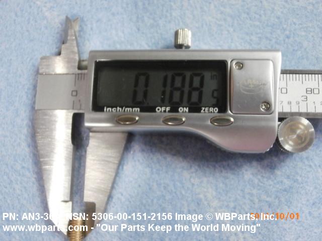 5306-00-151-2156 An externally threaded fastener designed for insertion through holes in assembled parts and normally intended to be tightened or released by torquing a nut. The threaded and unthreaded portions are both of one nominal diameter of 0.190 inch (5 mm) or larger. The head is not designed to be held or driven with an inserted driver or by the thumb and fingers. A locking feature may be incorporated in the design of the head or threads. Head dimensions and sizes of threaded and unthreaded portions shall conform to internationally recognized fastener standards. For items having a grip length portion machined to a tolerance of 0.0015 inch (0.038 mm) or less, BOLT, SHEAR. See also SCREW, CAP, HEXAGON HEAD and SCREW, MACHINE.