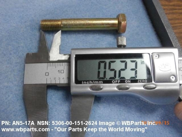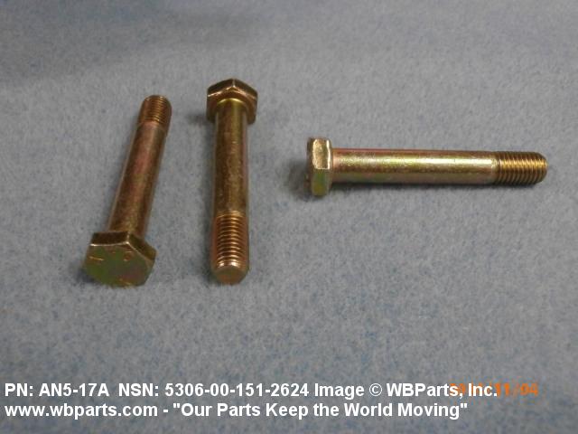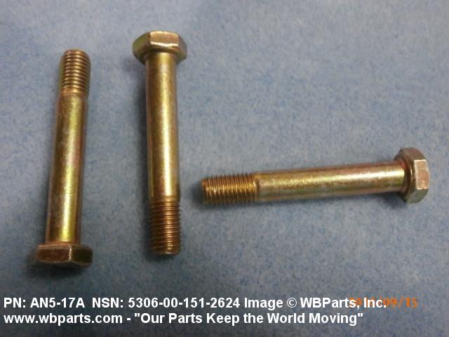 5306-00-151-2624 An externally threaded fastener designed for insertion through holes in assembled parts and normally intended to be tightened or released by torquing a nut. The threaded and unthreaded portions are both of one nominal diameter of 0.190 inch (5 mm) or larger. The head is not designed to be held or driven with an inserted driver or by the thumb and fingers. A locking feature may be incorporated in the design of the head or threads. Head dimensions and sizes of threaded and unthreaded portions shall conform to internationally recognized fastener standards. For items having a grip length portion machined to a tolerance of 0.0015 inch (0.038 mm) or less, BOLT, SHEAR. See also SCREW, CAP, HEXAGON HEAD and SCREW, MACHINE.