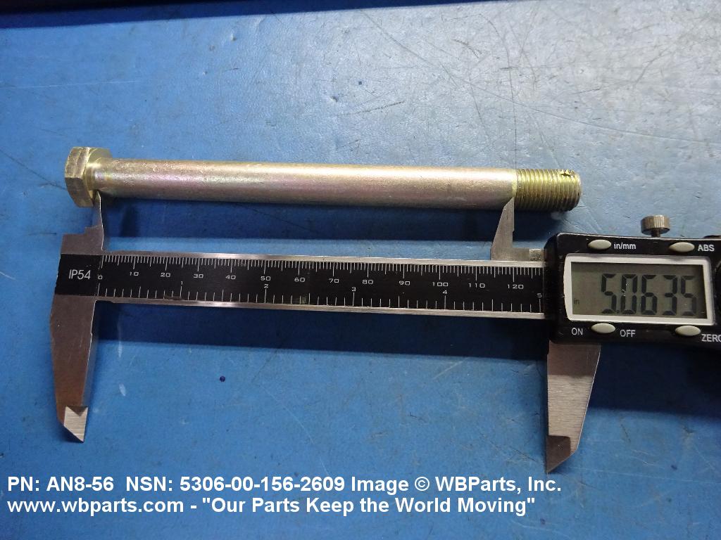 5306-00-156-2609 An externally threaded fastener designed for insertion through holes in assembled parts and normally intended to be tightened or released by torquing a nut. The threaded and unthreaded portions are both of one nominal diameter of 0.190 inch (5 mm) or larger. The head is not designed to be held or driven with an inserted driver or by the thumb and fingers. A locking feature may be incorporated in the design of the head or threads. Head dimensions and sizes of threaded and unthreaded portions shall conform to internationally recognized fastener standards. For items having a grip length portion machined to a tolerance of 0.0015 inch (0.038 mm) or less, BOLT, SHEAR. See also SCREW, CAP, HEXAGON HEAD and SCREW, MACHINE.
