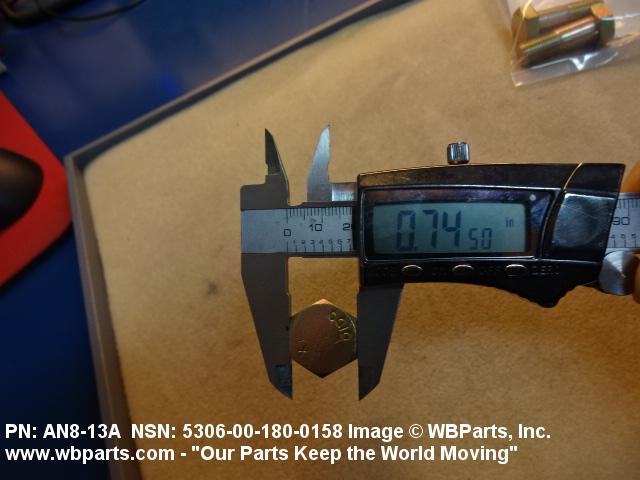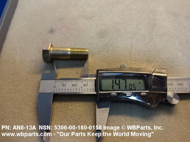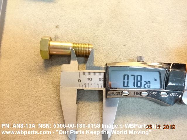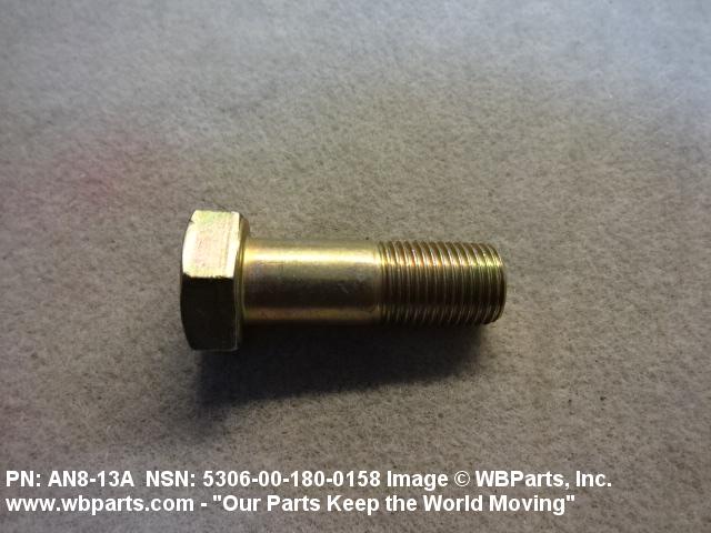 5306-00-180-0158 An externally threaded fastener designed for insertion through holes in assembled parts and normally intended to be tightened or released by torquing a nut. The threaded and unthreaded portions are both of one nominal diameter of 0.190 inch (5 mm) or larger. The head is not designed to be held or driven with an inserted driver or by the thumb and fingers. A locking feature may be incorporated in the design of the head or threads. Head dimensions and sizes of threaded and unthreaded portions shall conform to internationally recognized fastener standards. For items having a grip length portion machined to a tolerance of 0.0015 inch (0.038 mm) or less, BOLT, SHEAR. See also SCREW, CAP, HEXAGON HEAD and SCREW, MACHINE.