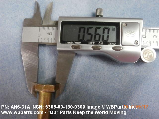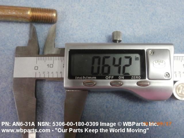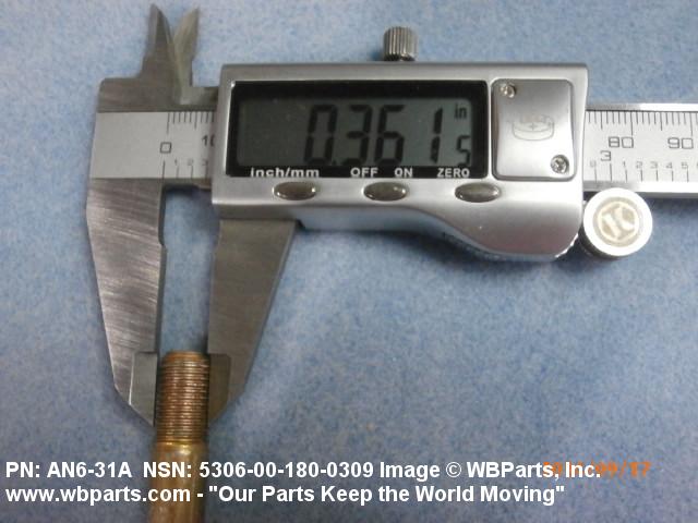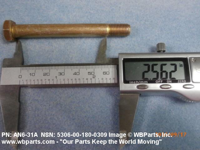 5306-00-180-0309 An externally threaded fastener designed for insertion through holes in assembled parts and normally intended to be tightened or released by torquing a nut. The threaded and unthreaded portions are both of one nominal diameter of 0.190 inch (5 mm) or larger. The head is not designed to be held or driven with an inserted driver or by the thumb and fingers. A locking feature may be incorporated in the design of the head or threads. Head dimensions and sizes of threaded and unthreaded portions shall conform to internationally recognized fastener standards. For items having a grip length portion machined to a tolerance of 0.0015 inch (0.038 mm) or less, BOLT, SHEAR. See also SCREW, CAP, HEXAGON HEAD and SCREW, MACHINE.