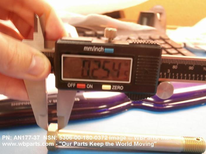 5306-00-180-0372 An externally threaded fastener whose unthreaded portion is of a specified grip length, plated or unplated, and is machined to a tolerance of one thousandth (0.001) of an inch (0.025 mm) or less of a specific diameter for items one inch (25 mm) or less in diameter. Items over one inch (25 mm) in diameter shall have a tolerance of fifteen ten-thousandths (0.0015) of an inch (0.038 mm) or less. The nominal major diameter of the threads shall be at least one thousandth (0.001) of an inch (0.025 mm) below the minimum shank diameter, but not below the minimum major diameter for applicable class of fit, as shown in the Screw Thread Standards, FED STD H28 and/or other nationally recognized standards. The head is not designed to be held or driven with an inserted driver, nor is it designed for rotation by the thumb and fingers. A locking feature may be incorporated in the design of the head or threads. For items having close tolerance, and fabricated from material having 160,000 pounds per square inch (1100 megapascals) minimum tensile strength, see BOLT, SHEAR. For items fabricated from material having less than 160,000 pounds per square inch (1100 megapascals) minimum tensile strength and not having a close tolerance, see BOLT, MACHINE.