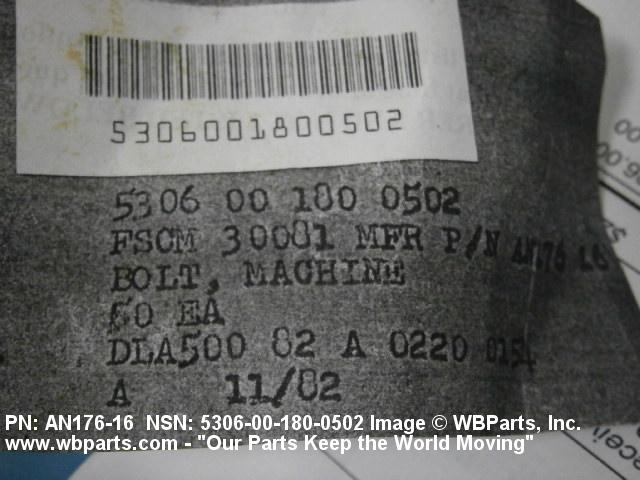 Part Alternates: AN17616, AN176-16, N5106302316, 5306-00-180-0502, 00-180-0502, 5306001800502, 001800502