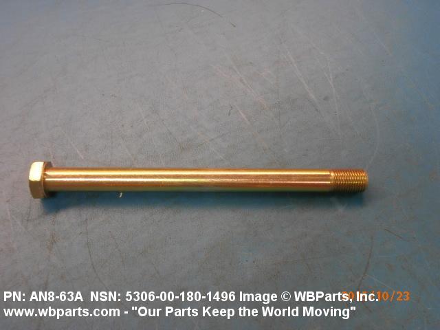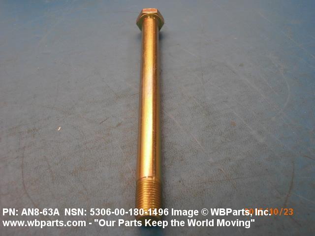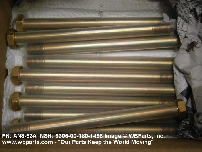 5306-00-180-1496 An externally threaded fastener designed for insertion through holes in assembled parts and normally intended to be tightened or released by torquing a nut. The threaded and unthreaded portions are both of one nominal diameter of 0.190 inch (5 mm) or larger. The head is not designed to be held or driven with an inserted driver or by the thumb and fingers. A locking feature may be incorporated in the design of the head or threads. Head dimensions and sizes of threaded and unthreaded portions shall conform to internationally recognized fastener standards. For items having a grip length portion machined to a tolerance of 0.0015 inch (0.038 mm) or less, BOLT, SHEAR. See also SCREW, CAP, HEXAGON HEAD and SCREW, MACHINE.