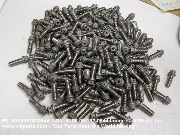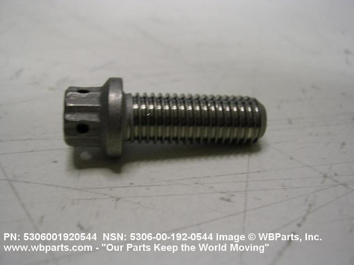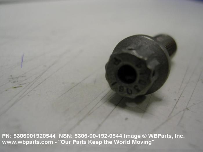 5306-00-192-0544 An externally threaded fastener designed for insertion through holes in assembled parts and normally intended to be tightened or released by torquing a nut. The threaded and unthreaded portions are both of one nominal diameter of 0.190 inch (5 mm) or larger. The head is not designed to be held or driven with an inserted driver or by the thumb and fingers. A locking feature may be incorporated in the design of the head or threads. Head dimensions and sizes of threaded and unthreaded portions shall conform to internationally recognized fastener standards. For items having a grip length portion machined to a tolerance of 0.0015 inch (0.038 mm) or less, BOLT, SHEAR. See also SCREW, CAP, HEXAGON HEAD and SCREW, MACHINE.