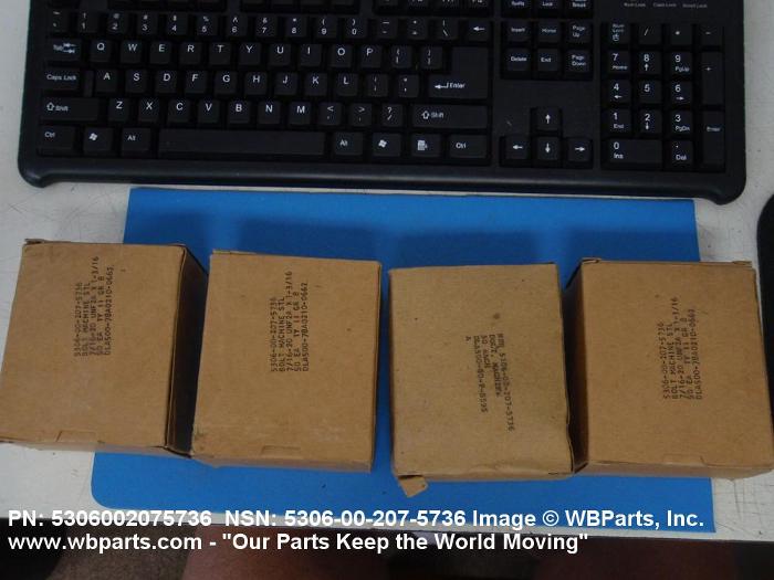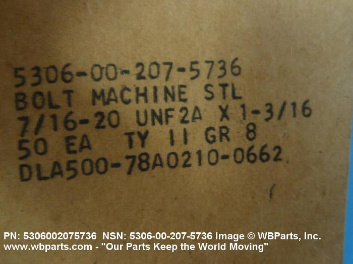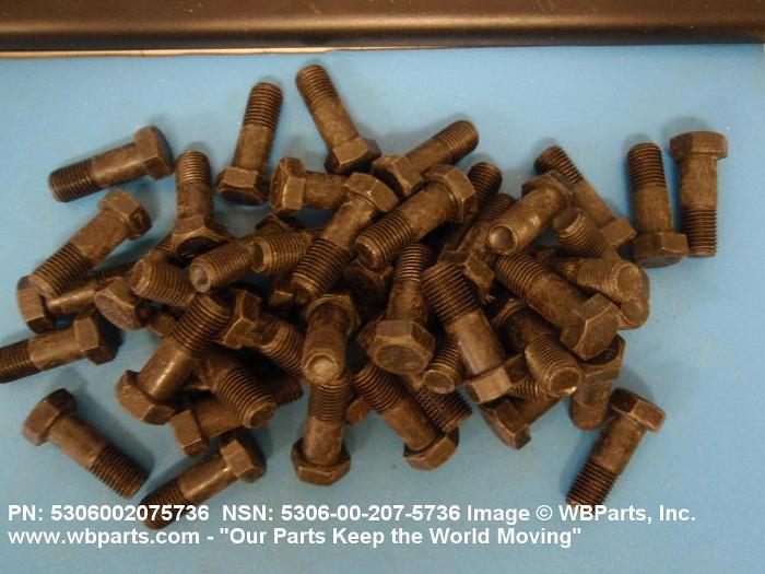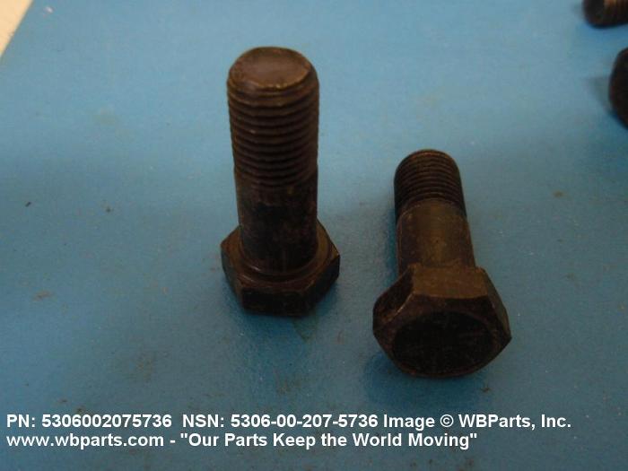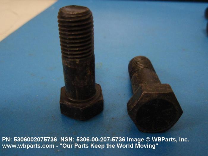 5306-00-207-5736 An externally threaded fastener designed for insertion through holes in assembled parts and normally intended to be tightened or released by torquing a nut. The threaded and unthreaded portions are both of one nominal diameter of 0.190 inch (5 mm) or larger. The head is not designed to be held or driven with an inserted driver or by the thumb and fingers. A locking feature may be incorporated in the design of the head or threads. Head dimensions and sizes of threaded and unthreaded portions shall conform to internationally recognized fastener standards. For items having a grip length portion machined to a tolerance of 0.0015 inch (0.038 mm) or less, BOLT, SHEAR. See also SCREW, CAP, HEXAGON HEAD and SCREW, MACHINE.
