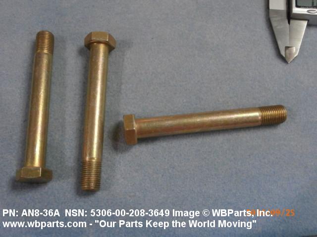 5306-00-208-3649 An externally threaded fastener designed for insertion through holes in assembled parts and normally intended to be tightened or released by torquing a nut. The threaded and unthreaded portions are both of one nominal diameter of 0.190 inch (5 mm) or larger. The head is not designed to be held or driven with an inserted driver or by the thumb and fingers. A locking feature may be incorporated in the design of the head or threads. Head dimensions and sizes of threaded and unthreaded portions shall conform to internationally recognized fastener standards. For items having a grip length portion machined to a tolerance of 0.0015 inch (0.038 mm) or less, BOLT, SHEAR. See also SCREW, CAP, HEXAGON HEAD and SCREW, MACHINE.