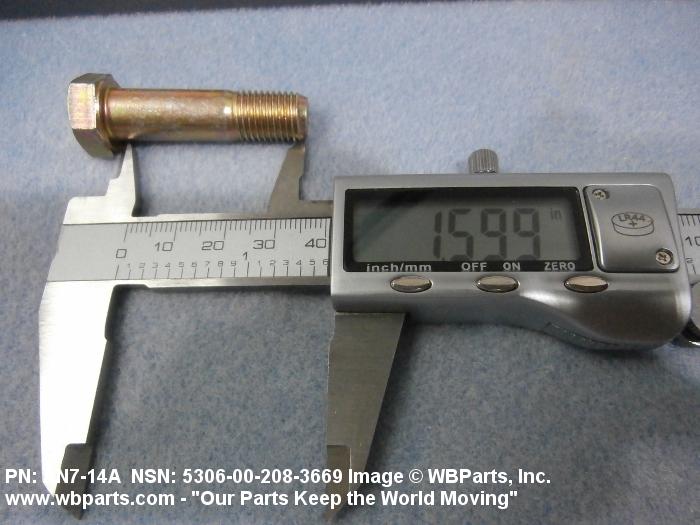 5306-00-208-3669 An externally threaded fastener designed for insertion through holes in assembled parts and normally intended to be tightened or released by torquing a nut. The threaded and unthreaded portions are both of one nominal diameter of 0.190 inch (5 mm) or larger. The head is not designed to be held or driven with an inserted driver or by the thumb and fingers. A locking feature may be incorporated in the design of the head or threads. Head dimensions and sizes of threaded and unthreaded portions shall conform to internationally recognized fastener standards. For items having a grip length portion machined to a tolerance of 0.0015 inch (0.038 mm) or less, BOLT, SHEAR. See also SCREW, CAP, HEXAGON HEAD and SCREW, MACHINE.