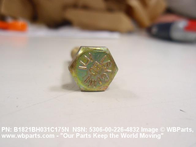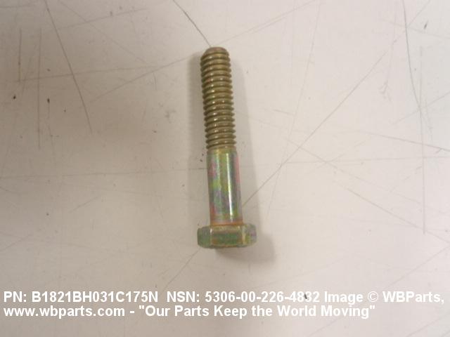 5306-00-226-4832 An externally threaded fastener designed for insertion through holes in assembled parts and normally intended to be tightened or released by torquing a nut. The threaded and unthreaded portions are both of one nominal diameter of 0.190 inch (5 mm) or larger. The head is not designed to be held or driven with an inserted driver or by the thumb and fingers. A locking feature may be incorporated in the design of the head or threads. Head dimensions and sizes of threaded and unthreaded portions shall conform to internationally recognized fastener standards. For items having a grip length portion machined to a tolerance of 0.0015 inch (0.038 mm) or less, BOLT, SHEAR. See also SCREW, CAP, HEXAGON HEAD and SCREW, MACHINE.