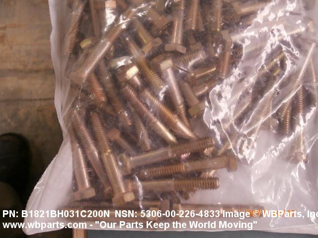 5306-00-226-4833 An externally threaded fastener designed for insertion through holes in assembled parts and normally intended to be tightened or released by torquing a nut. The threaded and unthreaded portions are both of one nominal diameter of 0.190 inch (5 mm) or larger. The head is not designed to be held or driven with an inserted driver or by the thumb and fingers. A locking feature may be incorporated in the design of the head or threads. Head dimensions and sizes of threaded and unthreaded portions shall conform to internationally recognized fastener standards. For items having a grip length portion machined to a tolerance of 0.0015 inch (0.038 mm) or less, BOLT, SHEAR. See also SCREW, CAP, HEXAGON HEAD and SCREW, MACHINE.