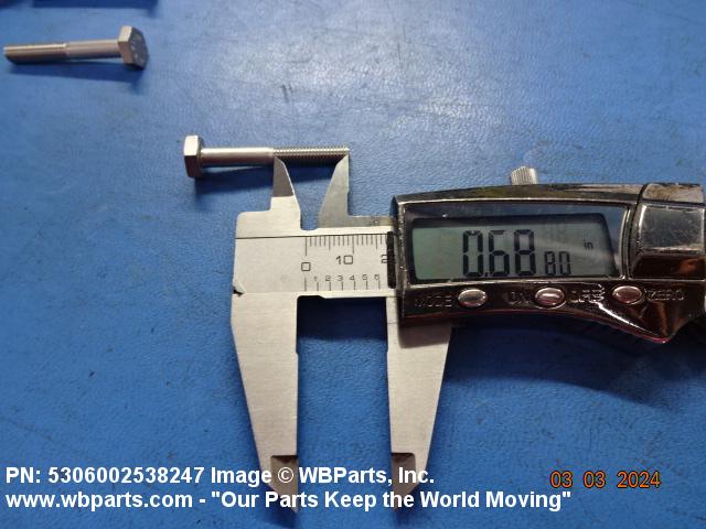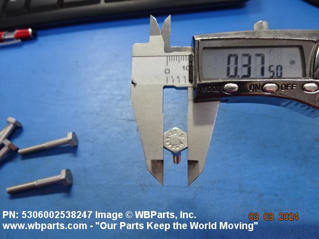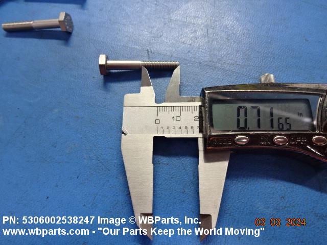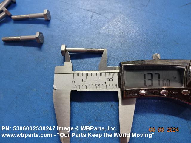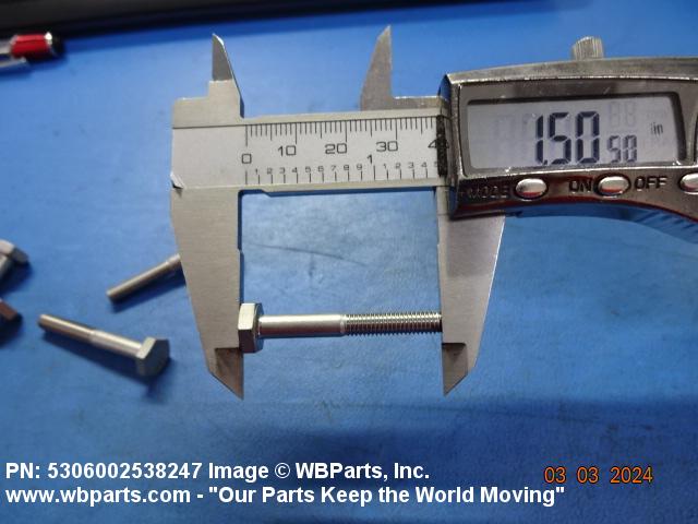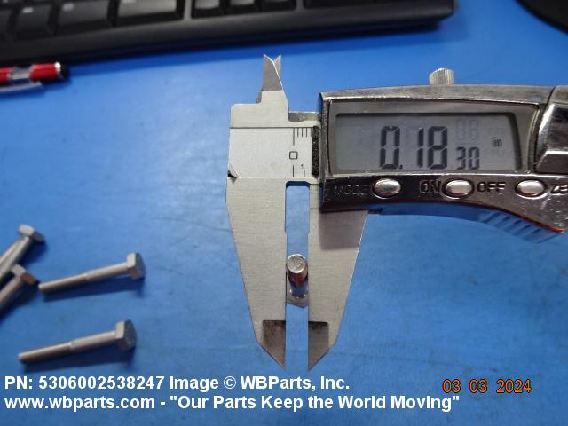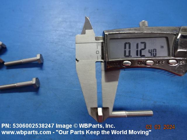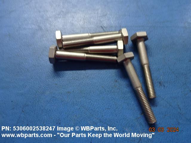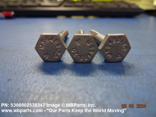 5306-00-253-8247 An externally threaded fastener designed for insertion through holes in assembled parts and normally intended to be tightened or released by torquing a nut. The threaded and unthreaded portions are both of one nominal diameter of 0.190 inch (5 mm) or larger. The head is not designed to be held or driven with an inserted driver or by the thumb and fingers. A locking feature may be incorporated in the design of the head or threads. Head dimensions and sizes of threaded and unthreaded portions shall conform to internationally recognized fastener standards. For items having a grip length portion machined to a tolerance of 0.0015 inch (0.038 mm) or less, BOLT, SHEAR. See also SCREW, CAP, HEXAGON HEAD and SCREW, MACHINE.