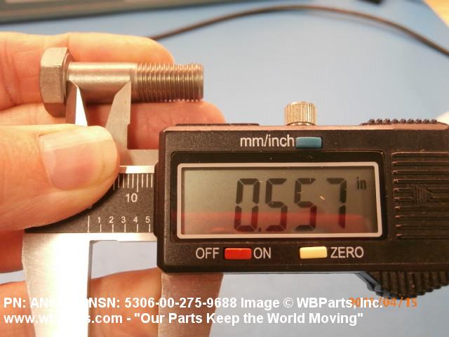 5306-00-275-9688 An externally threaded fastener designed for insertion through holes in assembled parts and normally intended to be tightened or released by torquing a nut. The threaded and unthreaded portions are both of one nominal diameter of 0.190 inch (5 mm) or larger. The head is not designed to be held or driven with an inserted driver or by the thumb and fingers. A locking feature may be incorporated in the design of the head or threads. Head dimensions and sizes of threaded and unthreaded portions shall conform to internationally recognized fastener standards. For items having a grip length portion machined to a tolerance of 0.0015 inch (0.038 mm) or less, BOLT, SHEAR. See also SCREW, CAP, HEXAGON HEAD and SCREW, MACHINE.