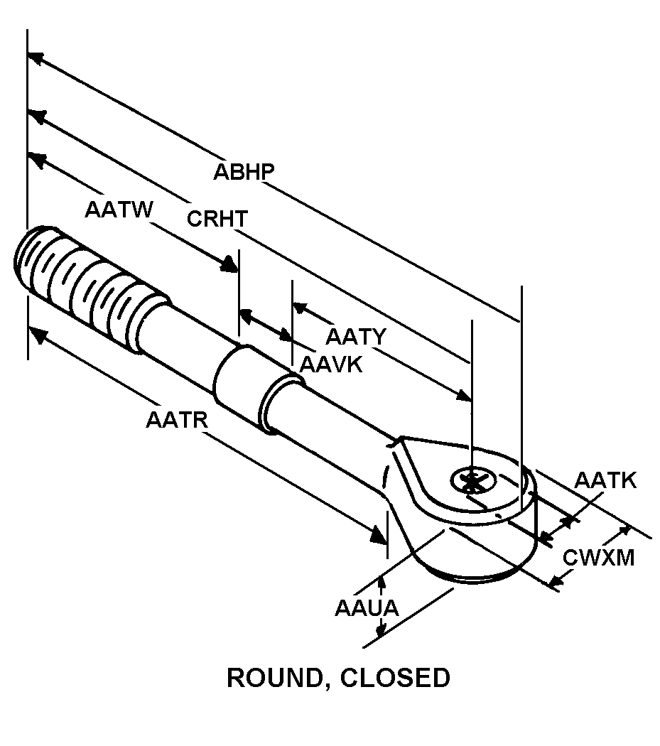 5306-00-346-2179 An externally threaded device whose threaded portion is of one nominal diameter, without a head, but with the unthreaded end either bent more than 225 degrees (3.925 radians) or cast, forged, or punched to resemble an eye. See also BOLT, HOOK. Excludes CONNECTOR, ROD END.