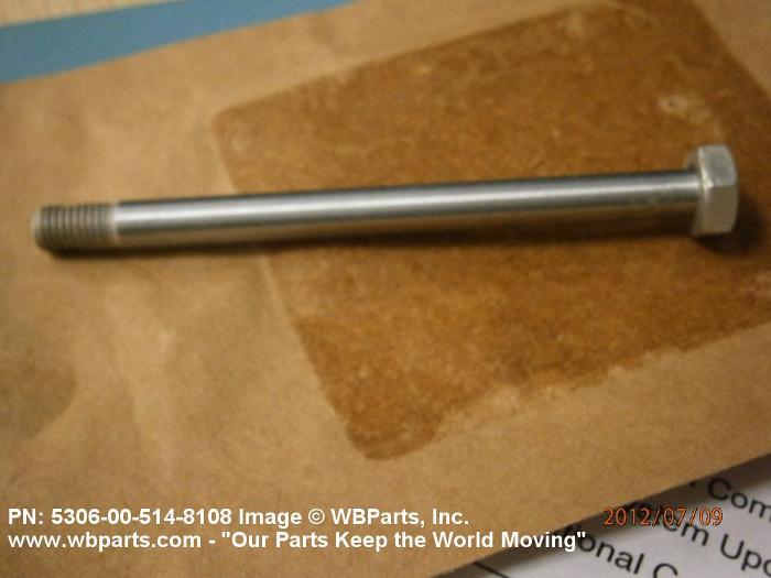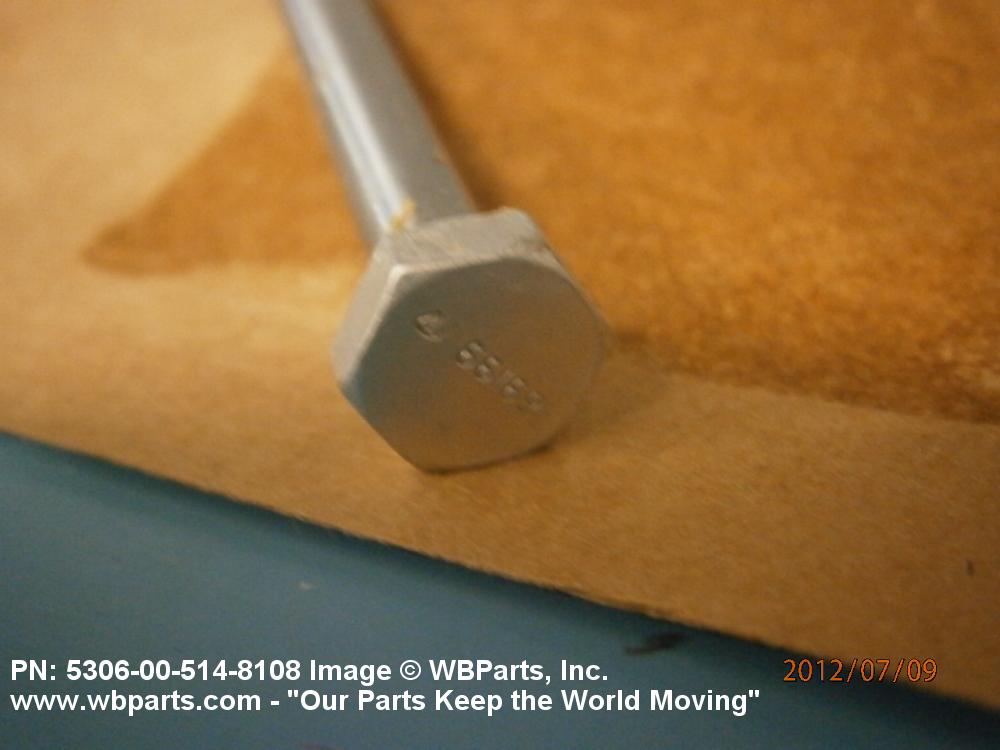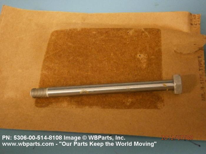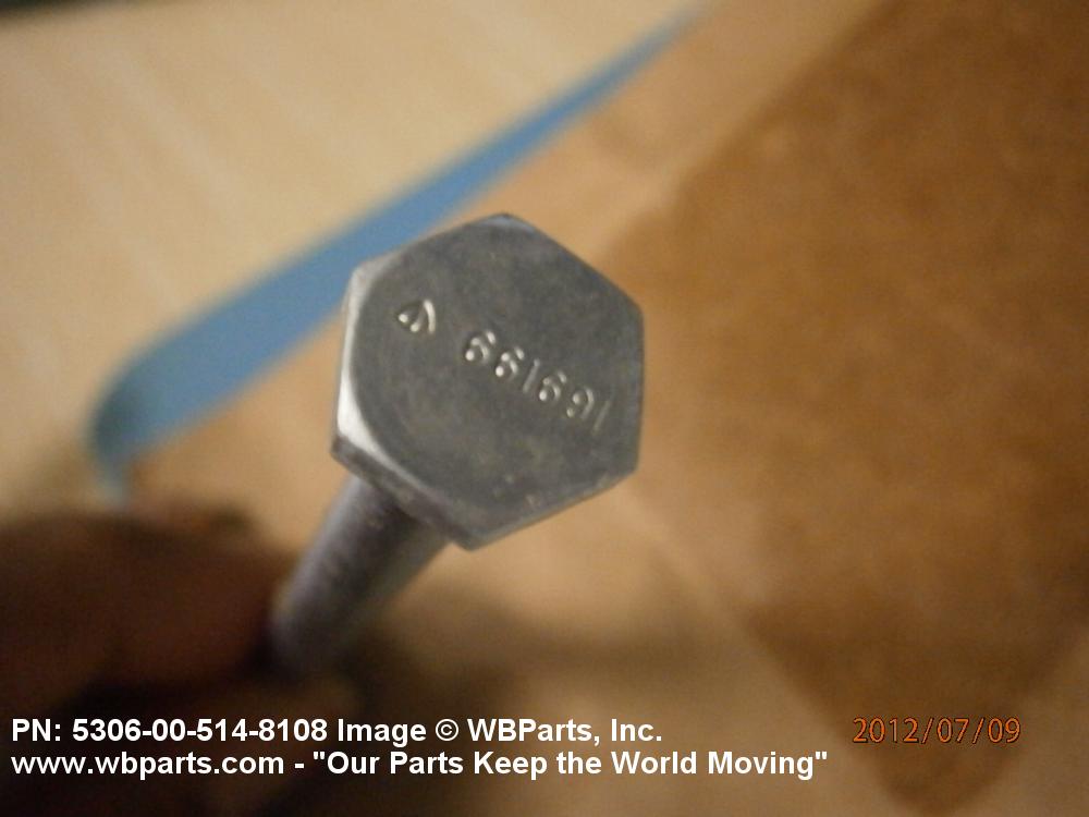 5306-00-514-8108 An externally threaded fastener designed for insertion through holes in assembled parts and normally intended to be tightened or released by torquing a nut. The threaded and unthreaded portions are both of one nominal diameter of 0.190 inch (5 mm) or larger. The head is not designed to be held or driven with an inserted driver or by the thumb and fingers. A locking feature may be incorporated in the design of the head or threads. Head dimensions and sizes of threaded and unthreaded portions shall conform to internationally recognized fastener standards. For items having a grip length portion machined to a tolerance of 0.0015 inch (0.038 mm) or less, BOLT, SHEAR. See also SCREW, CAP, HEXAGON HEAD and SCREW, MACHINE.