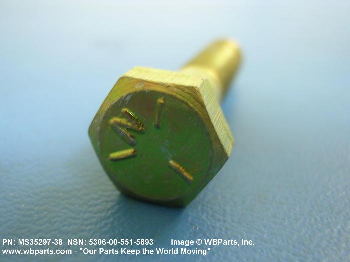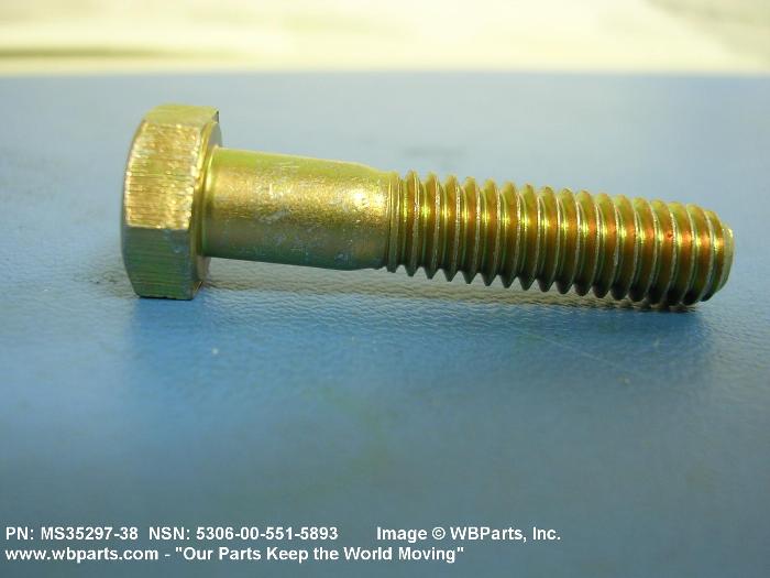 5306-00-551-5893 An externally threaded fastener designed for insertion through holes in assembled parts and normally intended to be tightened or released by torquing a nut. The threaded and unthreaded portions are both of one nominal diameter of 0.190 inch (5 mm) or larger. The head is not designed to be held or driven with an inserted driver or by the thumb and fingers. A locking feature may be incorporated in the design of the head or threads. Head dimensions and sizes of threaded and unthreaded portions shall conform to internationally recognized fastener standards. For items having a grip length portion machined to a tolerance of 0.0015 inch (0.038 mm) or less, BOLT, SHEAR. See also SCREW, CAP, HEXAGON HEAD and SCREW, MACHINE.