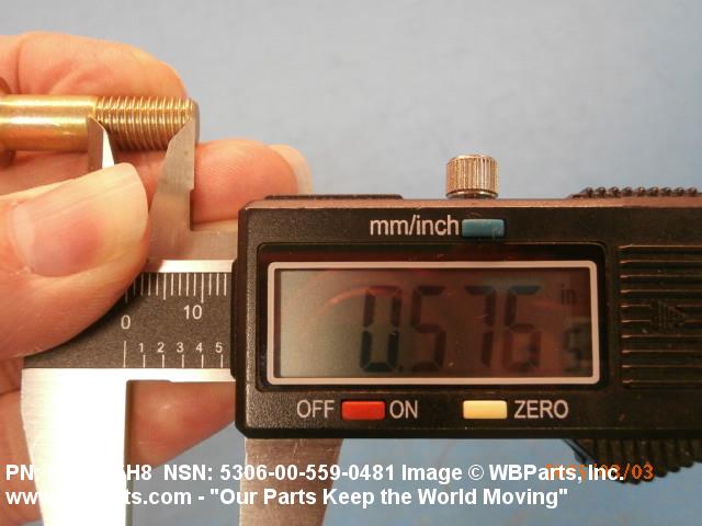 5306-00-559-0481 A high strength, 160,000 pounds per square inch (1100 megapascals) minimum tensile strength externally threaded fastener designed for use in applications involving great shear stress. The head is designed to accommodate an external wrench or driver. The head is not designed to be held or driven with an inserted driver, nor is it designed for rotation by the thumb and fingers. The unthreaded portion is of specific grip length, plated or unplated, and is machined to a tolerance of one thousandth (0.001) of an inch (0.025 mm) or less of a specific diameter for items one inch (25 mm) or less in diameter. Items over one inch (25 mm) in diameter shall have a tolerance of fifteen ten thousandths (0.0015) of an inch (0.038 mm) or less. The nominal major diameter of the threads shall be at least one thousandth (0.001) of an inch (0.025 mm) below the minimum shank diameter, but not below the minimum major diameter for applicable class of fit, as shown in the Screw Thread Standards, FED STD H28 and/or other nationally recognized standards. A locking feature may be incorporated in the design of the head or threads. See BOLT, MACHINE and BOLT, CLEVIS.