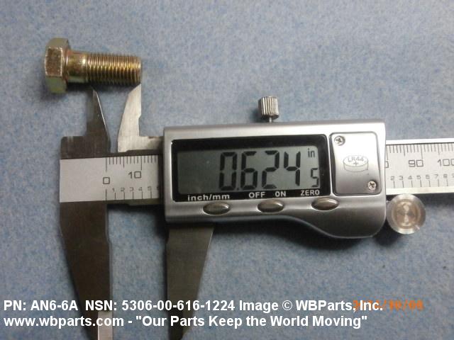 5306-00-616-1224 An externally threaded fastener designed for insertion through holes in assembled parts and normally intended to be tightened or released by torquing a nut. The threaded and unthreaded portions are both of one nominal diameter of 0.190 inch (5 mm) or larger. The head is not designed to be held or driven with an inserted driver or by the thumb and fingers. A locking feature may be incorporated in the design of the head or threads. Head dimensions and sizes of threaded and unthreaded portions shall conform to internationally recognized fastener standards. For items having a grip length portion machined to a tolerance of 0.0015 inch (0.038 mm) or less, BOLT, SHEAR. See also SCREW, CAP, HEXAGON HEAD and SCREW, MACHINE.