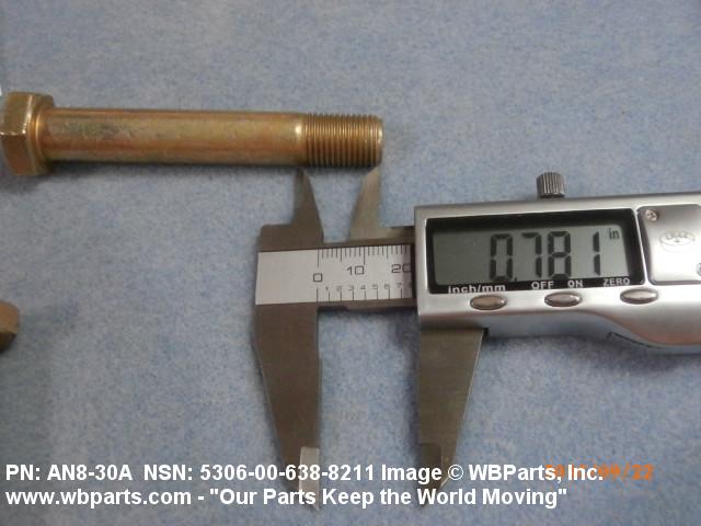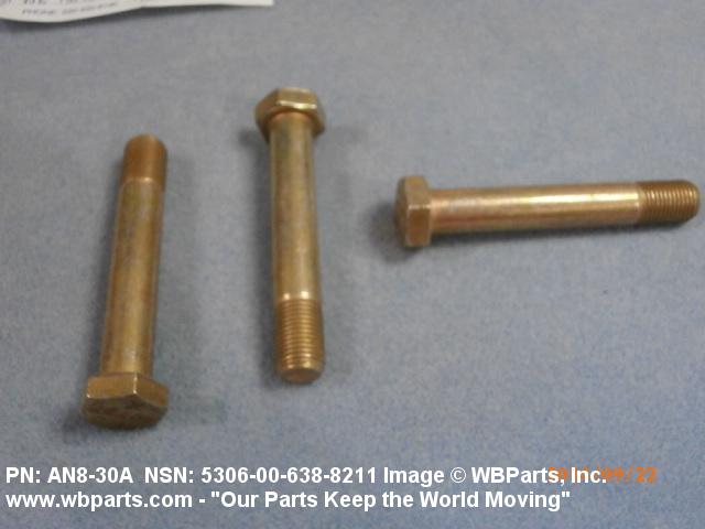 5306-00-638-8211 An externally threaded fastener designed for insertion through holes in assembled parts and normally intended to be tightened or released by torquing a nut. The threaded and unthreaded portions are both of one nominal diameter of 0.190 inch (5 mm) or larger. The head is not designed to be held or driven with an inserted driver or by the thumb and fingers. A locking feature may be incorporated in the design of the head or threads. Head dimensions and sizes of threaded and unthreaded portions shall conform to internationally recognized fastener standards. For items having a grip length portion machined to a tolerance of 0.0015 inch (0.038 mm) or less, BOLT, SHEAR. See also SCREW, CAP, HEXAGON HEAD and SCREW, MACHINE.