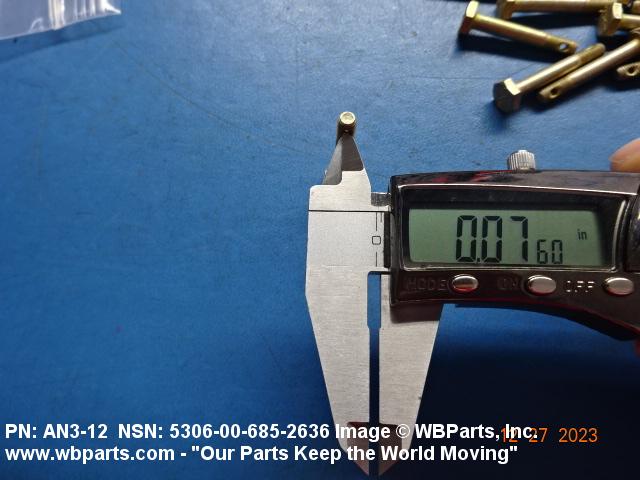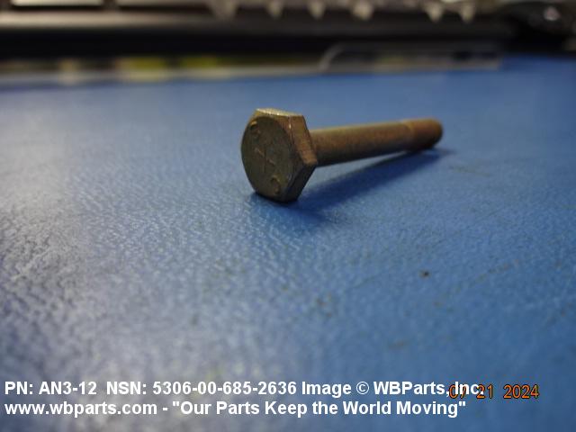 5306-00-685-2636 An externally threaded fastener designed for insertion through holes in assembled parts and normally intended to be tightened or released by torquing a nut. The threaded and unthreaded portions are both of one nominal diameter of 0.190 inch (5 mm) or larger. The head is not designed to be held or driven with an inserted driver or by the thumb and fingers. A locking feature may be incorporated in the design of the head or threads. Head dimensions and sizes of threaded and unthreaded portions shall conform to internationally recognized fastener standards. For items having a grip length portion machined to a tolerance of 0.0015 inch (0.038 mm) or less, BOLT, SHEAR. See also SCREW, CAP, HEXAGON HEAD and SCREW, MACHINE.