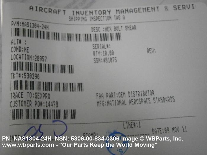 Part Alternates: NAS130424H, NAS1304-24H, 5306-00-834-0306, 00-834-0306, 5306008340306, 008340306