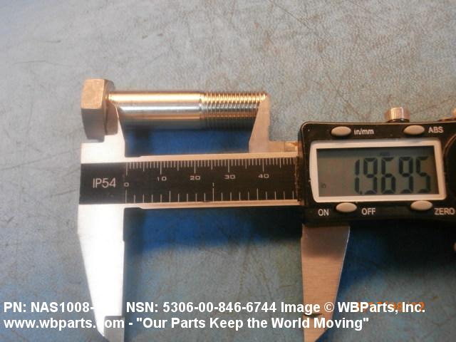 5306-00-846-6744 An externally threaded fastener designed for insertion through holes in assembled parts and normally intended to be tightened or released by torquing a nut. The threaded and unthreaded portions are both of one nominal diameter of 0.190 inch (5 mm) or larger. The head is not designed to be held or driven with an inserted driver or by the thumb and fingers. A locking feature may be incorporated in the design of the head or threads. Head dimensions and sizes of threaded and unthreaded portions shall conform to internationally recognized fastener standards. For items having a grip length portion machined to a tolerance of 0.0015 inch (0.038 mm) or less, BOLT, SHEAR. See also SCREW, CAP, HEXAGON HEAD and SCREW, MACHINE.