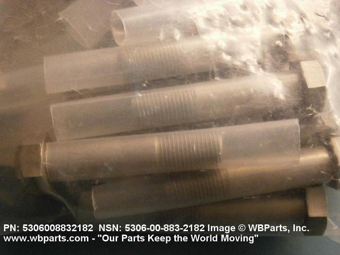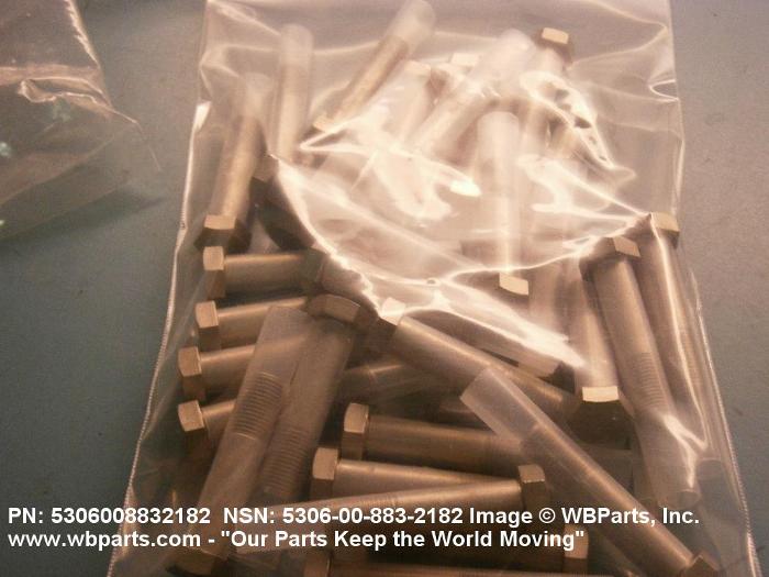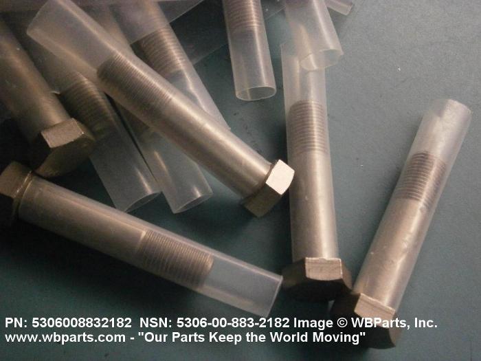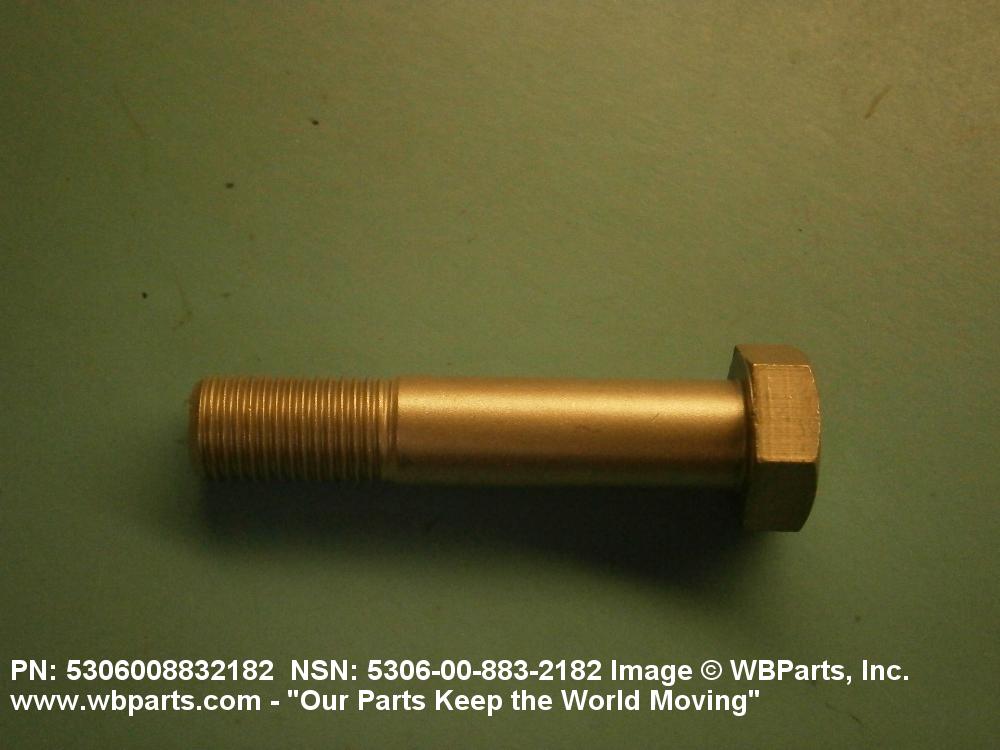 5306-00-883-2182 An externally threaded fastener designed for insertion through holes in assembled parts and normally intended to be tightened or released by torquing a nut. The threaded and unthreaded portions are both of one nominal diameter of 0.190 inch (5 mm) or larger. The head is not designed to be held or driven with an inserted driver or by the thumb and fingers. A locking feature may be incorporated in the design of the head or threads. Head dimensions and sizes of threaded and unthreaded portions shall conform to internationally recognized fastener standards. For items having a grip length portion machined to a tolerance of 0.0015 inch (0.038 mm) or less, BOLT, SHEAR. See also SCREW, CAP, HEXAGON HEAD and SCREW, MACHINE.
