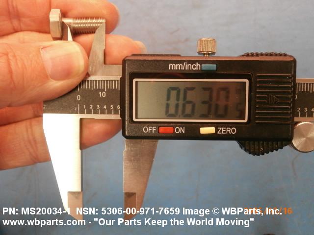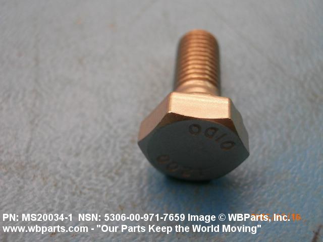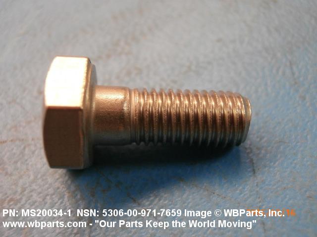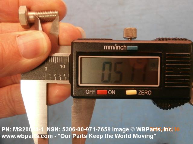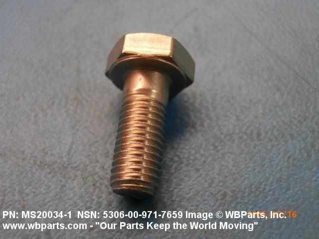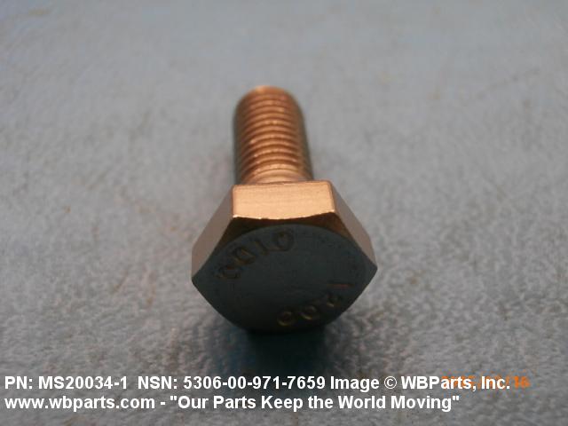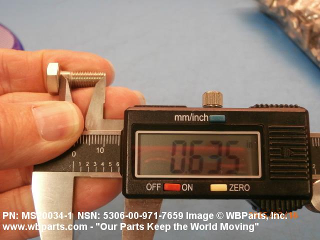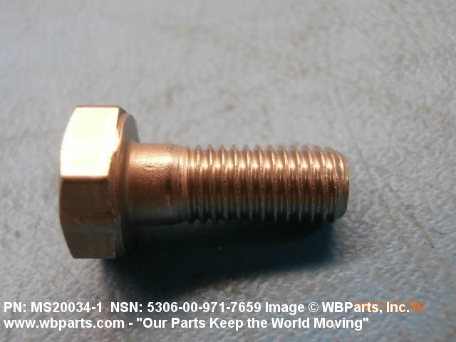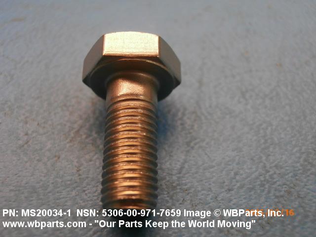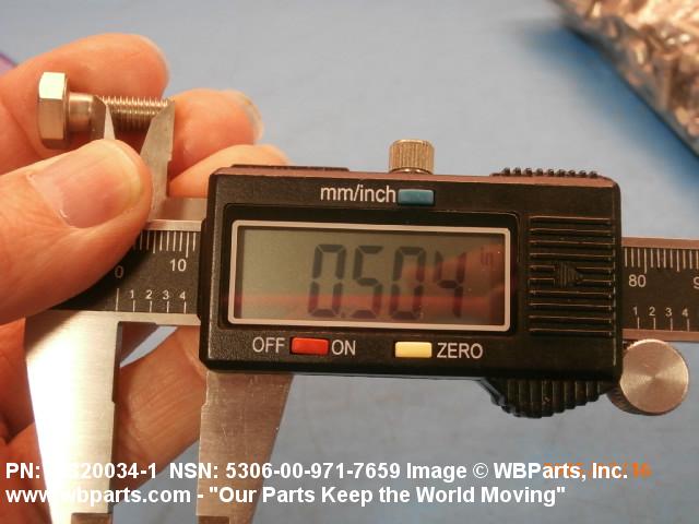 5306-00-971-7659 An externally threaded fastener designed for insertion through holes in assembled parts and normally intended to be tightened or released by torquing a nut. The threaded and unthreaded portions are both of one nominal diameter of 0.190 inch (5 mm) or larger. The head is not designed to be held or driven with an inserted driver or by the thumb and fingers. A locking feature may be incorporated in the design of the head or threads. Head dimensions and sizes of threaded and unthreaded portions shall conform to internationally recognized fastener standards. For items having a grip length portion machined to a tolerance of 0.0015 inch (0.038 mm) or less, BOLT, SHEAR. See also SCREW, CAP, HEXAGON HEAD and SCREW, MACHINE.