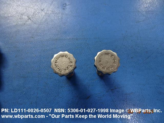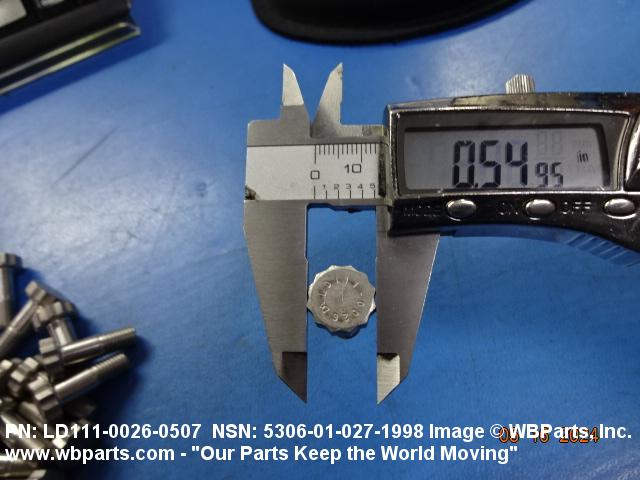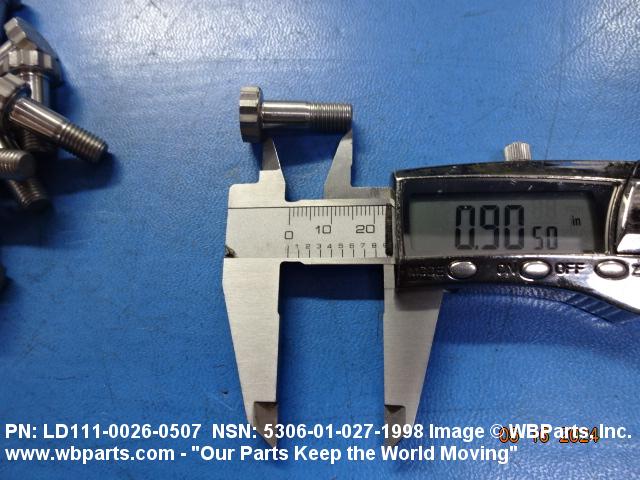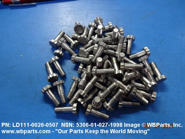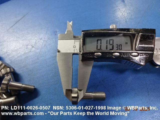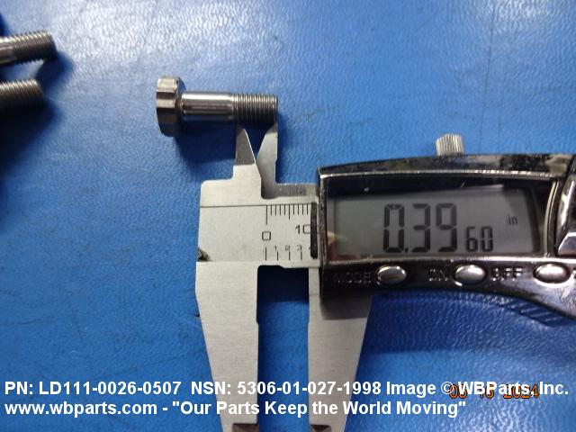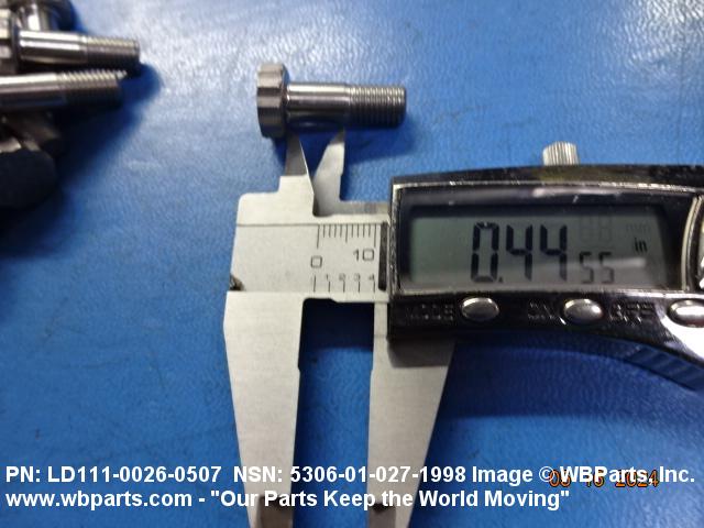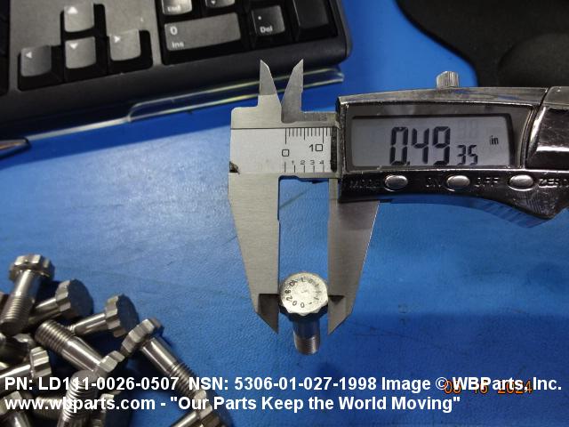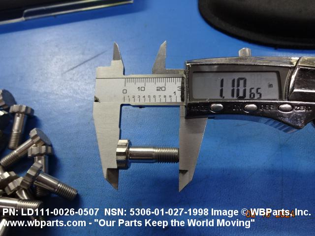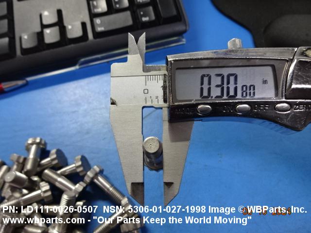5306-01-027-1998 An externally threaded fastener whose unthreaded portion is of a specified grip length, plated or unplated, and is machined to a tolerance of one thousandth (0.001) of an inch (0.025 mm) or less of a specific diameter for items one inch (25 mm) or less in diameter. Items over one inch (25 mm) in diameter shall have a tolerance of fifteen ten-thousandths (0.0015) of an inch (0.038 mm) or less. The nominal major diameter of the threads shall be at least one thousandth (0.001) of an inch (0.025 mm) below the minimum shank diameter, but not below the minimum major diameter for applicable class of fit, as shown in the Screw Thread Standards, FED STD H28 and/or other nationally recognized standards. The head is not designed to be held or driven with an inserted driver, nor is it designed for rotation by the thumb and fingers. A locking feature may be incorporated in the design of the head or threads. For items having close tolerance, and fabricated from material having 160,000 pounds per square inch (1100 megapascals) minimum tensile strength, see BOLT, SHEAR. For items fabricated from material having less than 160,000 pounds per square inch (1100 megapascals) minimum tensile strength and not having a close tolerance, see BOLT, MACHINE.