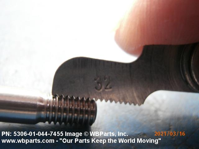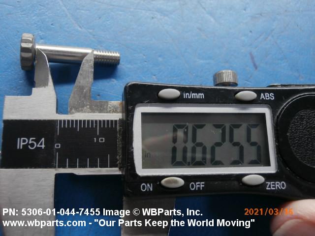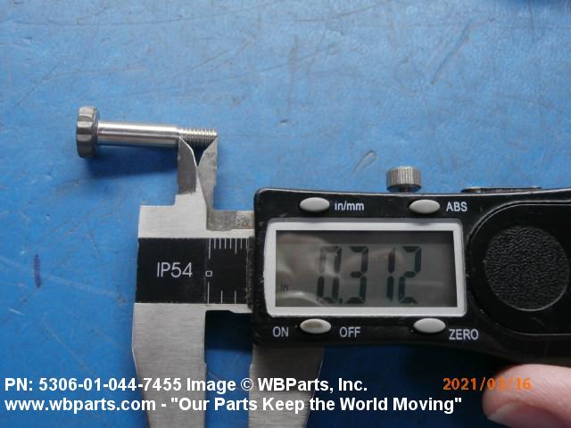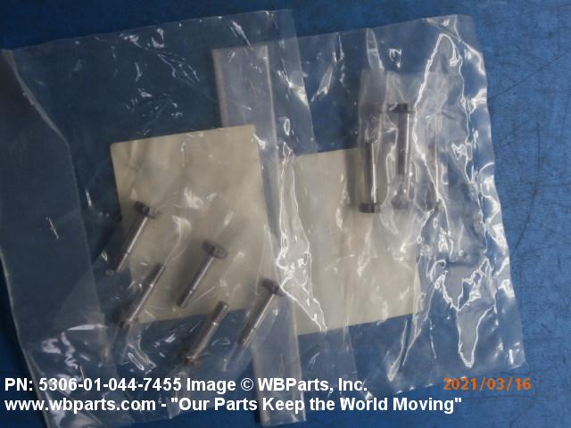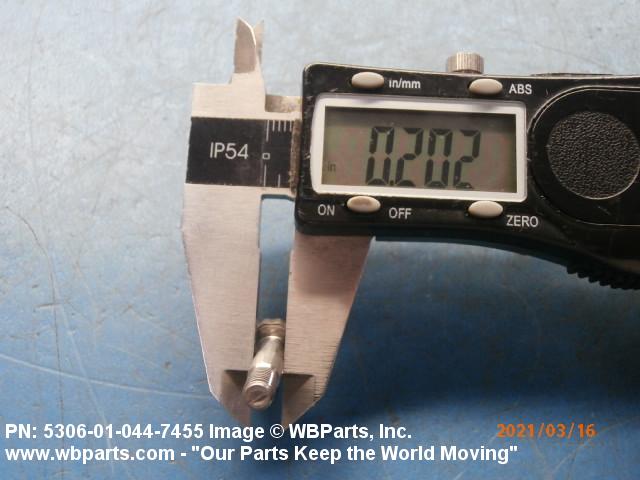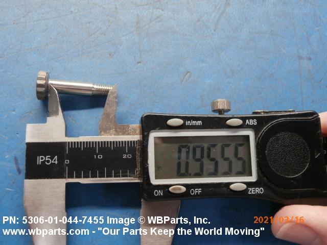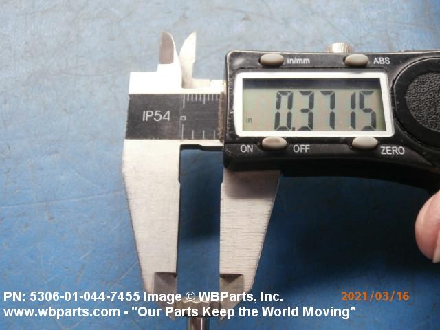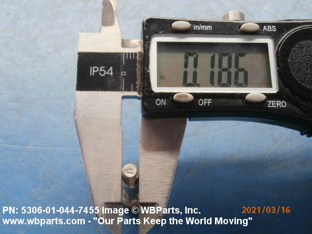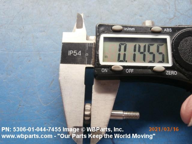 5306-01-044-7455 An externally threaded fastener whose threaded portion is of one nominal diameter, No. 10 (0.190 IN.) (5 mm) or larger. It has a round unthreaded neck or shank all or part of which is of greater diameter than the threaded portion. The head is not designed to be held or driven with an inserted drivers. A locking feature may be incorporated in the design of the head or threads. For items with a thread diameter smaller than No. 10 (0.190 IN.) (5 mm) and those items with an inserted drive head, use SCREW, SHOULDER. For items which are No. 10 (0.190 IN.) (5 mm) or larger in size and are both shouldered and have an externally relieved body, use BOLT, EXTERNALLY RELIEVED BODY. Excludes THUMBSCREW.