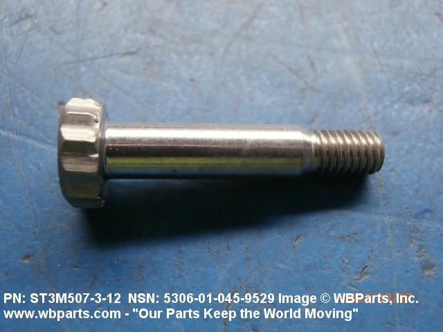 5306-01-045-9529 An externally threaded fastener whose threaded portion is of one nominal diameter, No. 10 (0.190 IN.) (5 mm) or larger. It has a round unthreaded neck or shank all or part of which is of greater diameter than the threaded portion. The head is not designed to be held or driven with an inserted drivers. A locking feature may be incorporated in the design of the head or threads. For items with a thread diameter smaller than No. 10 (0.190 IN.) (5 mm) and those items with an inserted drive head, use SCREW, SHOULDER. For items which are No. 10 (0.190 IN.) (5 mm) or larger in size and are both shouldered and have an externally relieved body, use BOLT, EXTERNALLY RELIEVED BODY. Excludes THUMBSCREW.