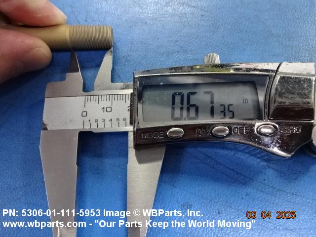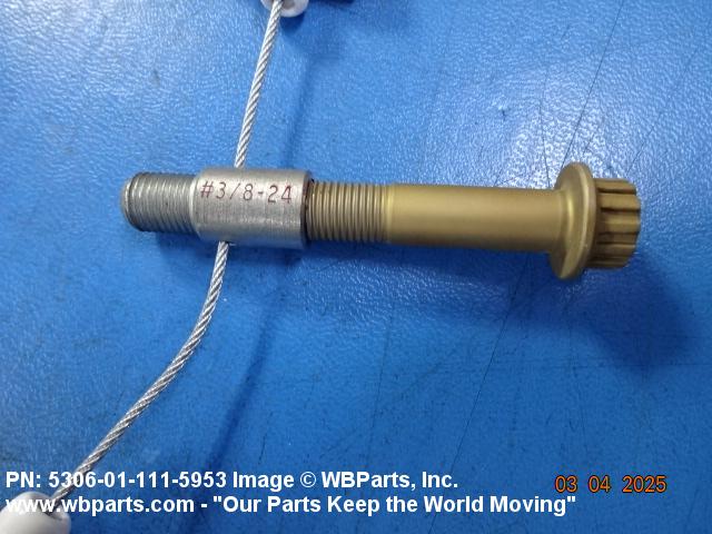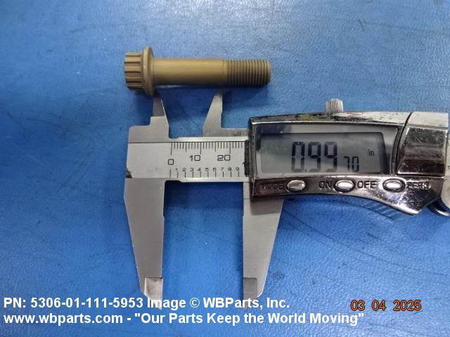 5306-01-111-5953 A high strength, 160,000 pounds per square inch (1100 megapascals) minimum tensile strength externally threaded fastener designed for use in applications involving great shear stress. The head is designed to accommodate an external wrench or driver. The head is not designed to be held or driven with an inserted driver, nor is it designed for rotation by the thumb and fingers. The unthreaded portion is of specific grip length, plated or unplated, and is machined to a tolerance of one thousandth (0.001) of an inch (0.025 mm) or less of a specific diameter for items one inch (25 mm) or less in diameter. Items over one inch (25 mm) in diameter shall have a tolerance of fifteen ten thousandths (0.0015) of an inch (0.038 mm) or less. The nominal major diameter of the threads shall be at least one thousandth (0.001) of an inch (0.025 mm) below the minimum shank diameter, but not below the minimum major diameter for applicable class of fit, as shown in the Screw Thread Standards, FED STD H28 and/or other nationally recognized standards. A locking feature may be incorporated in the design of the head or threads. See BOLT, MACHINE and BOLT, CLEVIS.