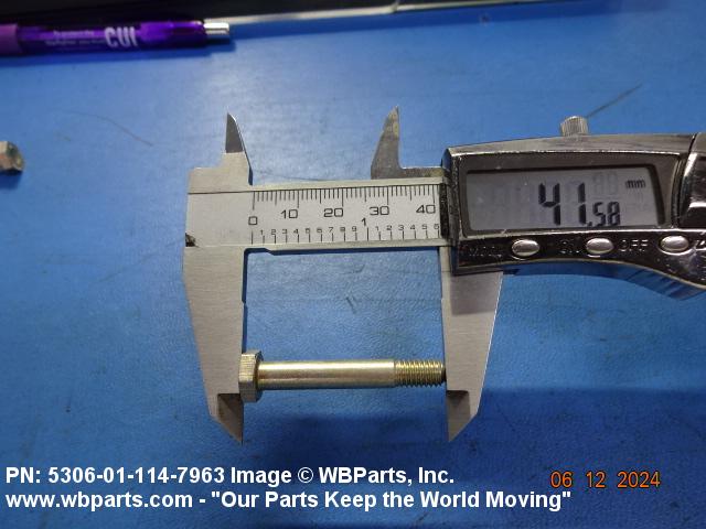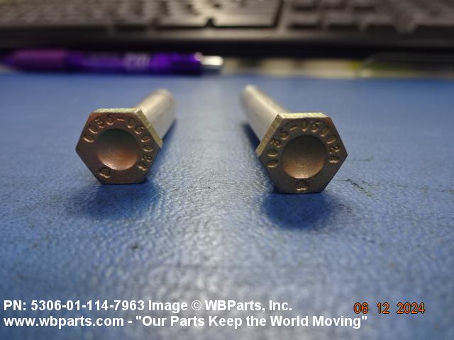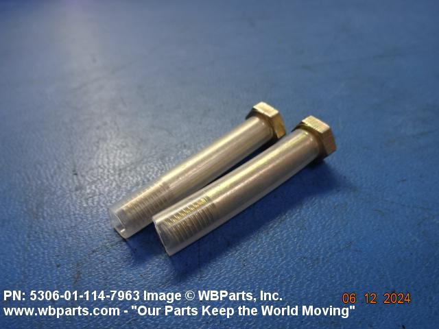 5306-01-114-7963 An externally threaded fastener whose unthreaded portion is of a specified grip length, plated or unplated, and is machined to a tolerance of one thousandth (0.001) of an inch (0.025 mm) or less of a specific diameter for items one inch (25 mm) or less in diameter. Items over one inch (25 mm) in diameter shall have a tolerance of fifteen ten-thousandths (0.0015) of an inch (0.038 mm) or less. The nominal major diameter of the threads shall be at least one thousandth (0.001) of an inch (0.025 mm) below the minimum shank diameter, but not below the minimum major diameter for applicable class of fit, as shown in the Screw Thread Standards, FED STD H28 and/or other nationally recognized standards. The head is not designed to be held or driven with an inserted driver, nor is it designed for rotation by the thumb and fingers. A locking feature may be incorporated in the design of the head or threads. For items having close tolerance, and fabricated from material having 160,000 pounds per square inch (1100 megapascals) minimum tensile strength, see BOLT, SHEAR. For items fabricated from material having less than 160,000 pounds per square inch (1100 megapascals) minimum tensile strength and not having a close tolerance, see BOLT, MACHINE.