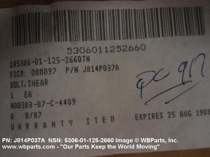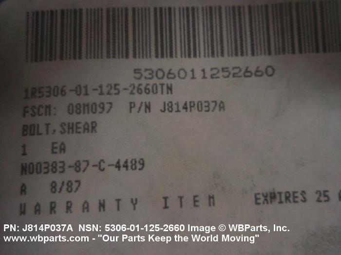 Part Alternates: J814P037A, 10115775 , 5306-01-125-2660, 01-125-2660, 5306011252660, 011252660