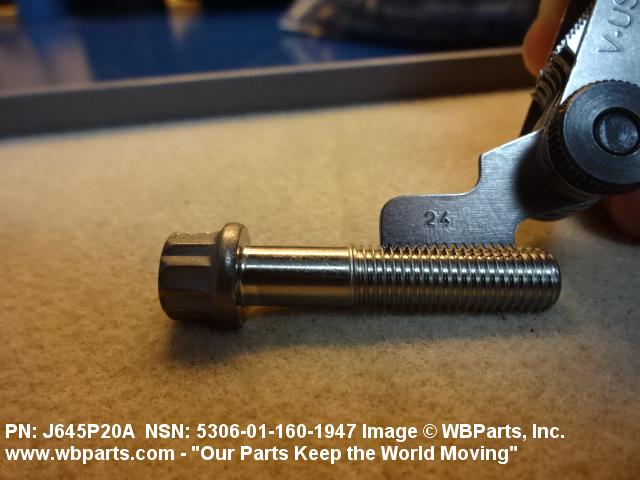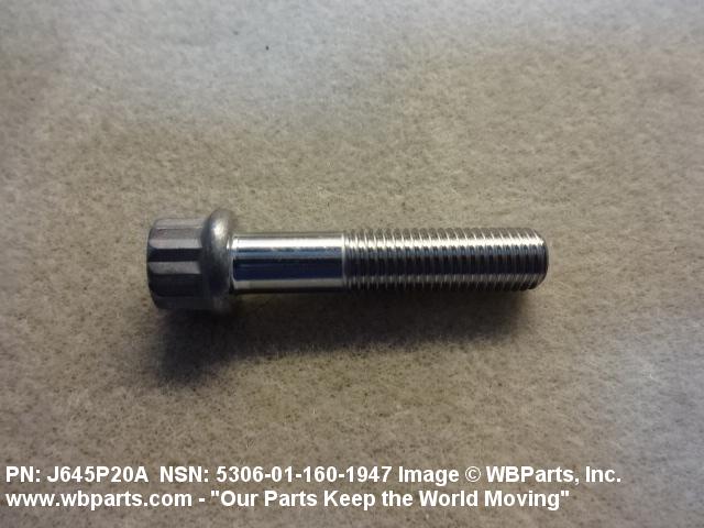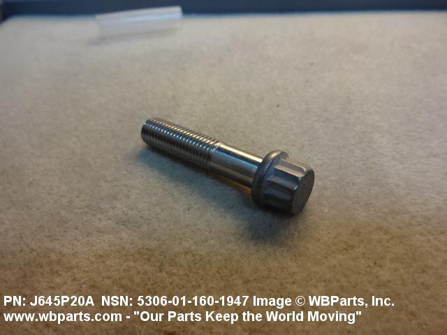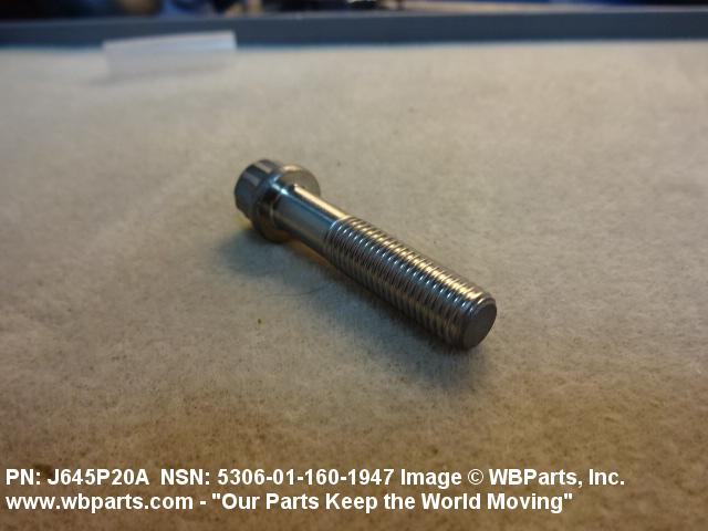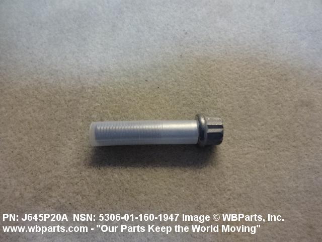 5306-01-160-1947 An externally threaded fastener designed for insertion through holes in assembled parts and normally intended to be tightened or released by torquing a nut. The threaded and unthreaded portions are both of one nominal diameter of 0.190 inch (5 mm) or larger. The head is not designed to be held or driven with an inserted driver or by the thumb and fingers. A locking feature may be incorporated in the design of the head or threads. Head dimensions and sizes of threaded and unthreaded portions shall conform to internationally recognized fastener standards. For items having a grip length portion machined to a tolerance of 0.0015 inch (0.038 mm) or less, BOLT, SHEAR. See also SCREW, CAP, HEXAGON HEAD and SCREW, MACHINE.