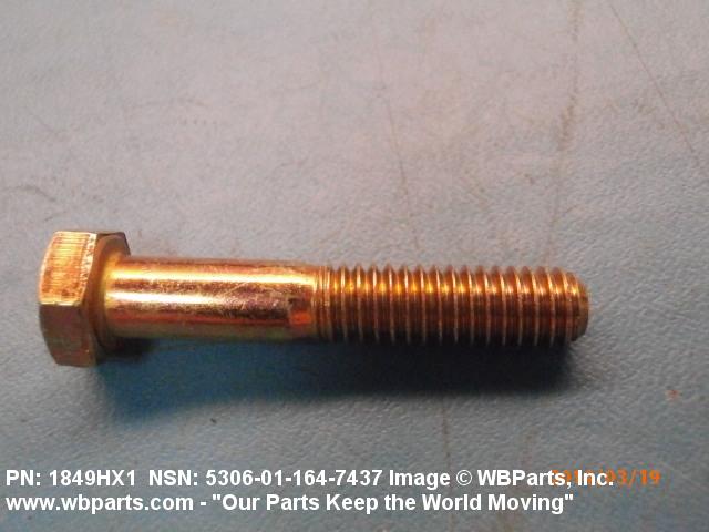 5306-01-164-7437 An externally threaded fastener designed for insertion through holes in assembled parts and normally intended to be tightened or released by torquing a nut. The threaded and unthreaded portions are both of one nominal diameter of 0.190 inch (5 mm) or larger. The head is not designed to be held or driven with an inserted driver or by the thumb and fingers. A locking feature may be incorporated in the design of the head or threads. Head dimensions and sizes of threaded and unthreaded portions shall conform to internationally recognized fastener standards. For items having a grip length portion machined to a tolerance of 0.0015 inch (0.038 mm) or less, BOLT, SHEAR. See also SCREW, CAP, HEXAGON HEAD and SCREW, MACHINE.