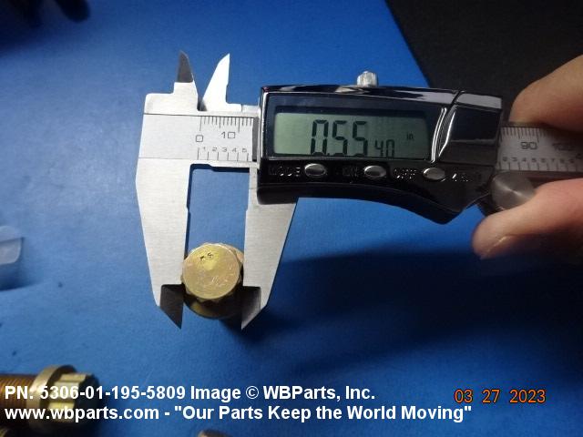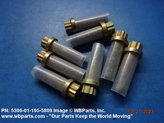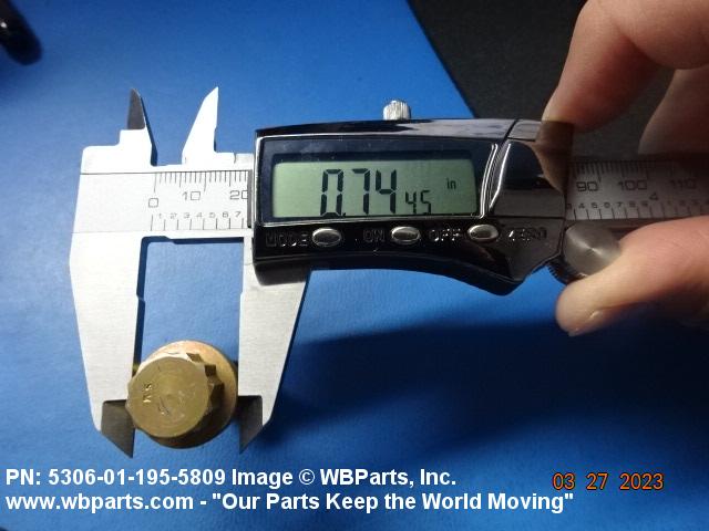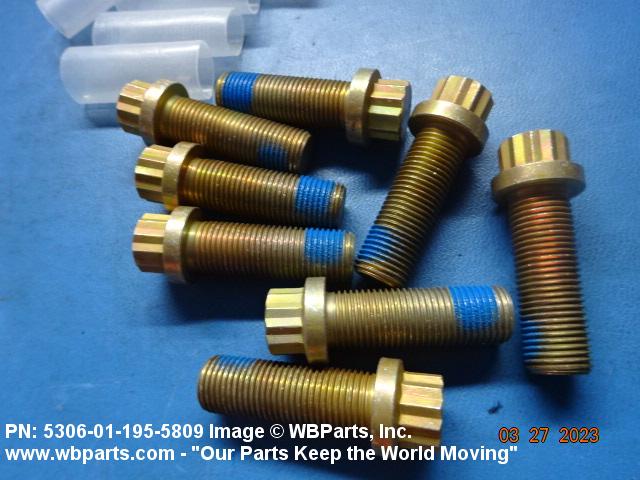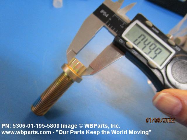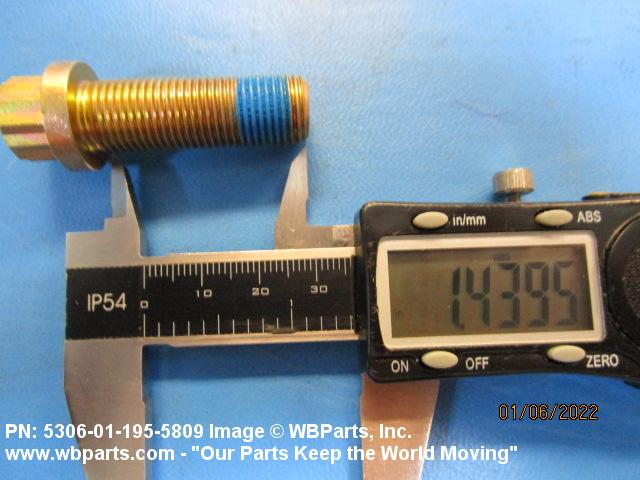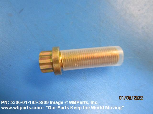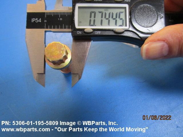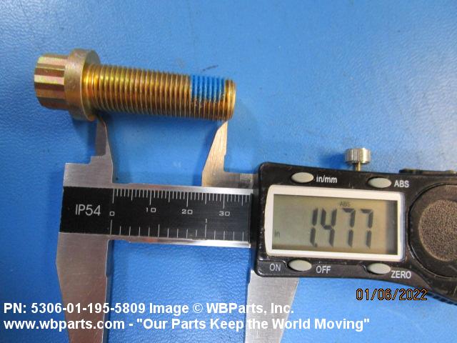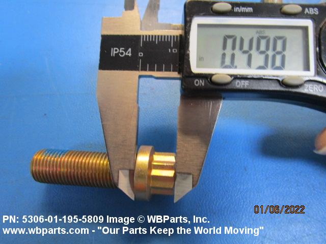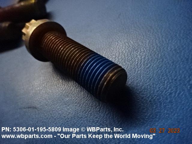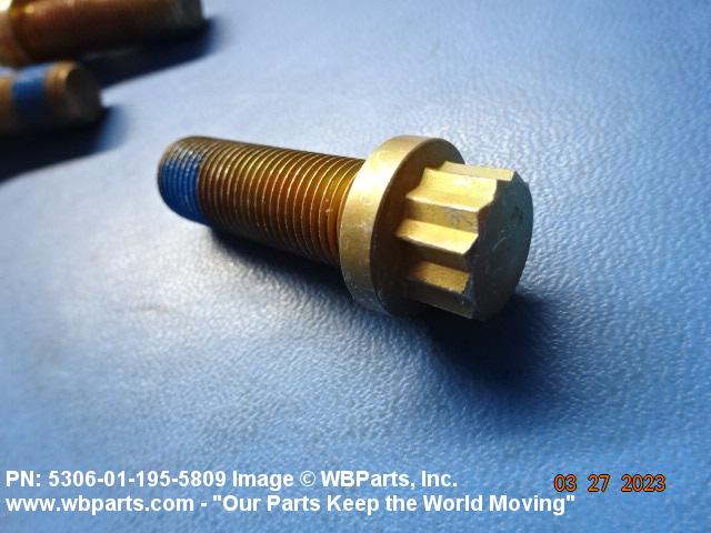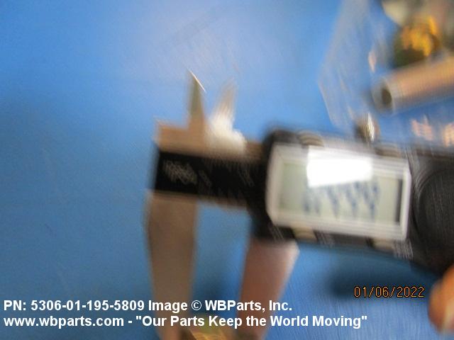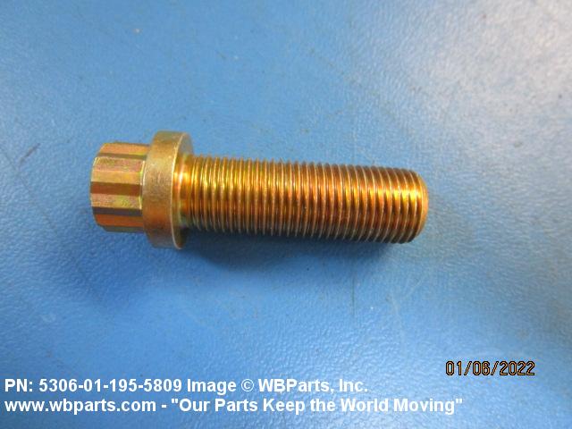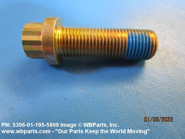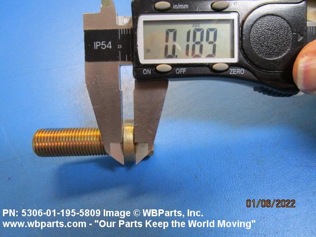 5306-01-195-5809 An externally threaded fastener designed for insertion through holes in assembled parts and normally intended to be tightened or released by torquing a nut. The threaded and unthreaded portions are both of one nominal diameter of 0.190 inch (5 mm) or larger. The head is not designed to be held or driven with an inserted driver or by the thumb and fingers. A locking feature may be incorporated in the design of the head or threads. Head dimensions and sizes of threaded and unthreaded portions shall conform to internationally recognized fastener standards. For items having a grip length portion machined to a tolerance of 0.0015 inch (0.038 mm) or less, BOLT, SHEAR. See also SCREW, CAP, HEXAGON HEAD and SCREW, MACHINE.