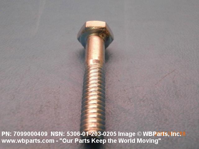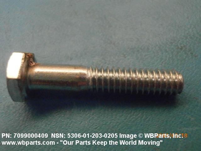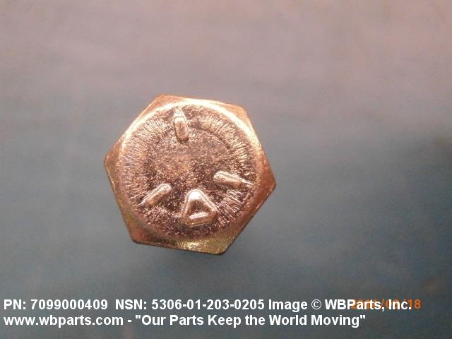 5306-01-203-0205 An externally threaded fastener designed for insertion through holes in assembled parts and normally intended to be tightened or released by torquing a nut. The threaded and unthreaded portions are both of one nominal diameter of 0.190 inch (5 mm) or larger. The head is not designed to be held or driven with an inserted driver or by the thumb and fingers. A locking feature may be incorporated in the design of the head or threads. Head dimensions and sizes of threaded and unthreaded portions shall conform to internationally recognized fastener standards. For items having a grip length portion machined to a tolerance of 0.0015 inch (0.038 mm) or less, BOLT, SHEAR. See also SCREW, CAP, HEXAGON HEAD and SCREW, MACHINE.