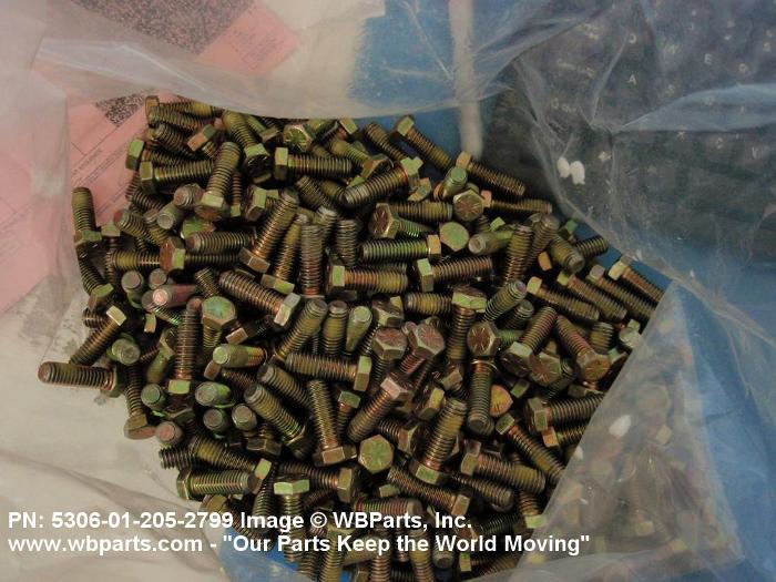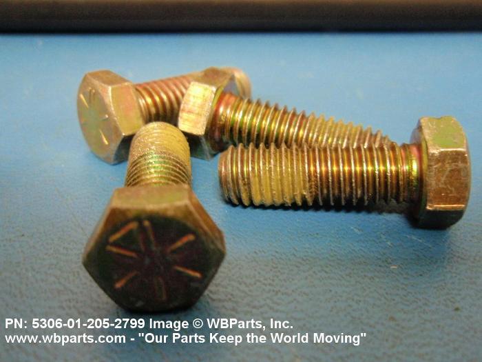 5306-01-205-2799 An externally threaded fastener designed for insertion through holes in assembled parts and normally intended to be tightened or released by torquing a nut. The threaded and unthreaded portions are both of one nominal diameter of 0.190 inch (5 mm) or larger. The head is not designed to be held or driven with an inserted driver or by the thumb and fingers. A locking feature may be incorporated in the design of the head or threads. Head dimensions and sizes of threaded and unthreaded portions shall conform to internationally recognized fastener standards. For items having a grip length portion machined to a tolerance of 0.0015 inch (0.038 mm) or less, BOLT, SHEAR. See also SCREW, CAP, HEXAGON HEAD and SCREW, MACHINE.