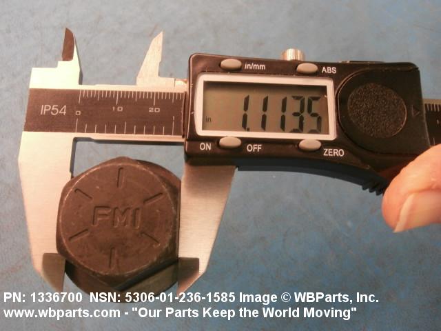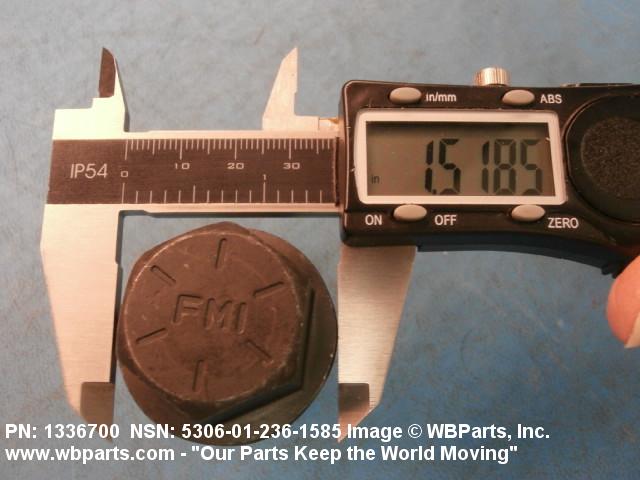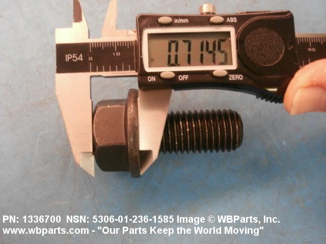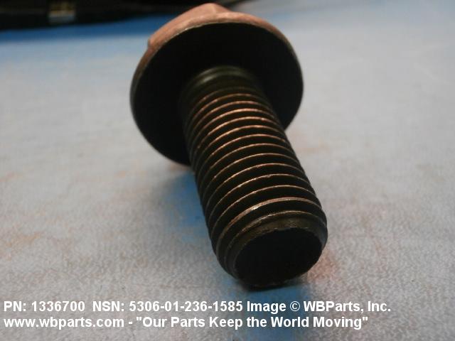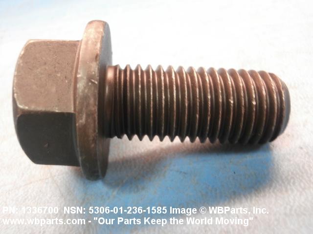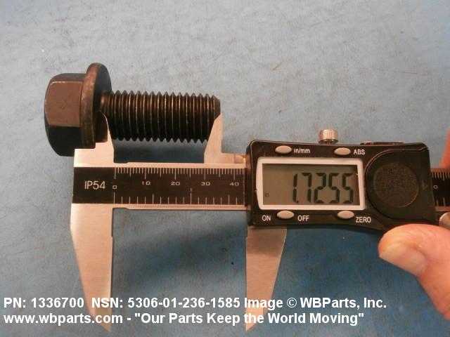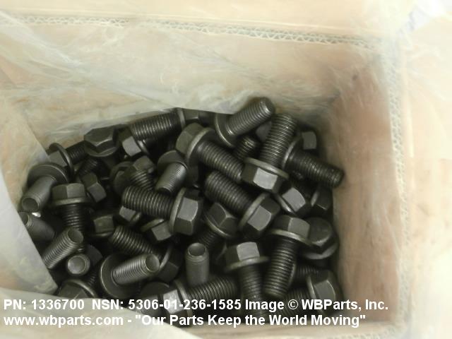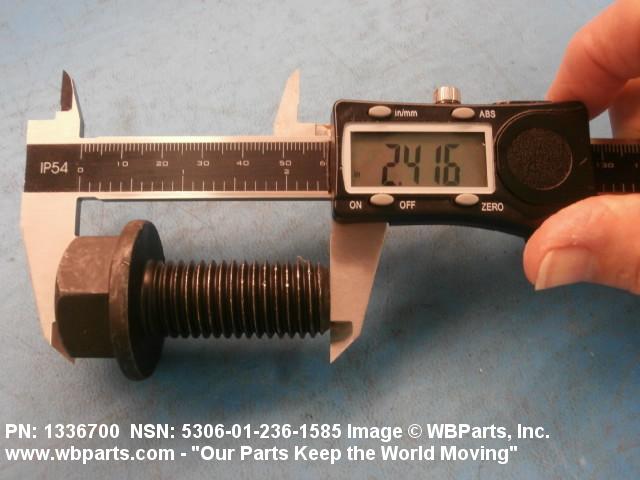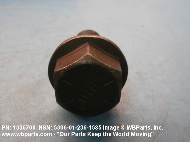 5306-01-236-1585 An externally threaded fastener designed for insertion through holes in assembled parts and normally intended to be tightened or released by torquing a nut. The threaded and unthreaded portions are both of one nominal diameter of 0.190 inch (5 mm) or larger. The head is not designed to be held or driven with an inserted driver or by the thumb and fingers. A locking feature may be incorporated in the design of the head or threads. Head dimensions and sizes of threaded and unthreaded portions shall conform to internationally recognized fastener standards. For items having a grip length portion machined to a tolerance of 0.0015 inch (0.038 mm) or less, BOLT, SHEAR. See also SCREW, CAP, HEXAGON HEAD and SCREW, MACHINE.