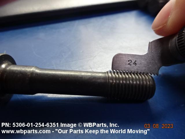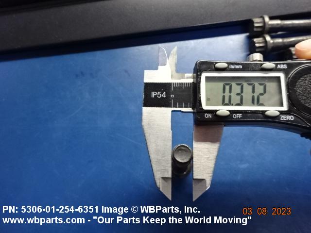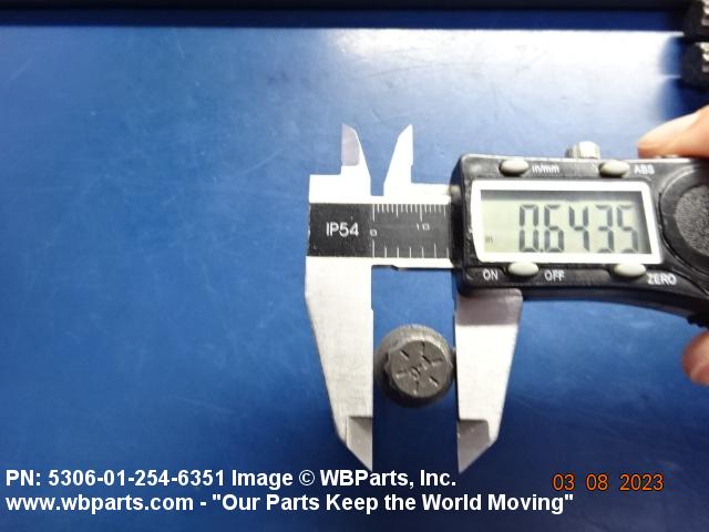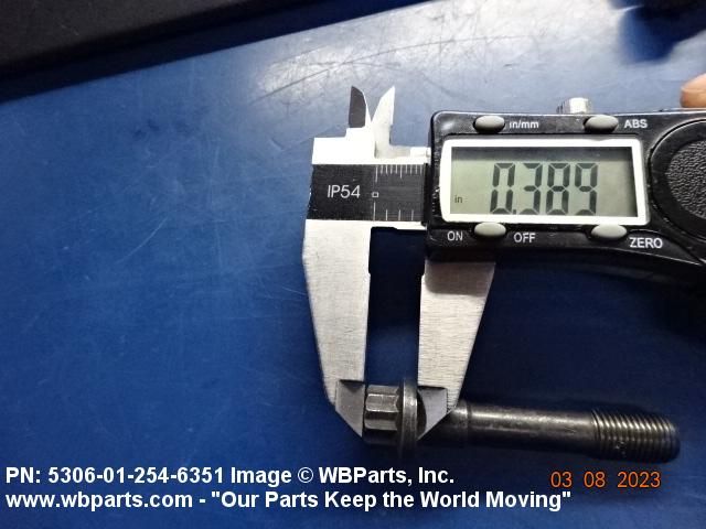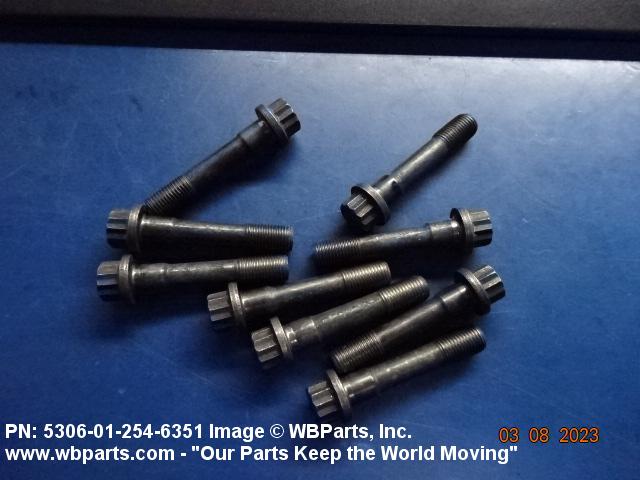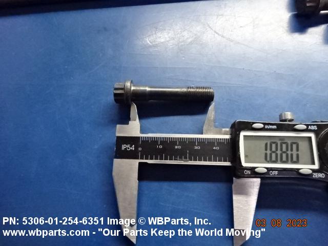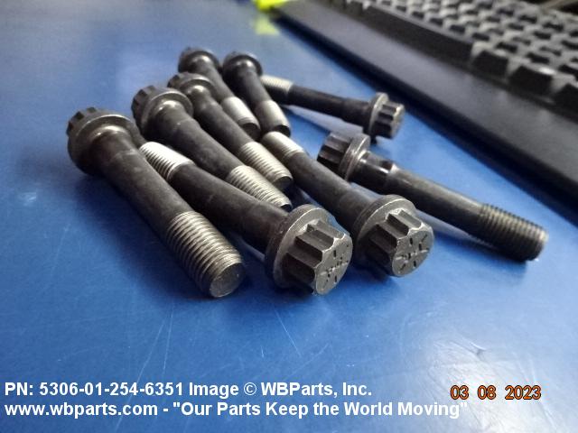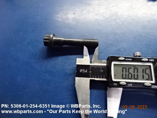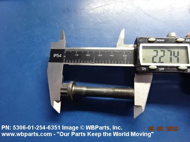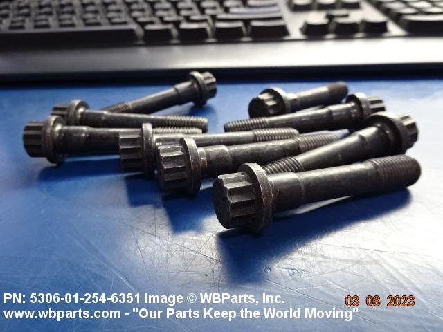 5306-01-254-6351 An externally threaded fastener designed for insertion through holes in assembled parts and normally intended to be tightened or released by torquing a nut. The threaded and unthreaded portions are both of one nominal diameter of 0.190 inch (5 mm) or larger. The head is not designed to be held or driven with an inserted driver or by the thumb and fingers. A locking feature may be incorporated in the design of the head or threads. Head dimensions and sizes of threaded and unthreaded portions shall conform to internationally recognized fastener standards. For items having a grip length portion machined to a tolerance of 0.0015 inch (0.038 mm) or less, BOLT, SHEAR. See also SCREW, CAP, HEXAGON HEAD and SCREW, MACHINE.