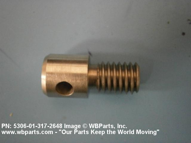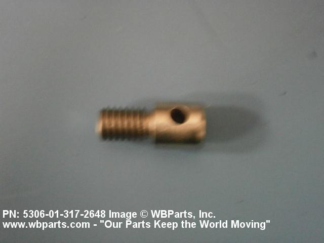 5306-01-317-2648 An externally threaded fastener designed for insertion through holes in assembled parts and normally intended to be tightened or released by torquing a nut. The threaded and unthreaded portions are both of one nominal diameter of 0.190 inch (5 mm) or larger. The head is not designed to be held or driven with an inserted driver or by the thumb and fingers. A locking feature may be incorporated in the design of the head or threads. Head dimensions and sizes of threaded and unthreaded portions shall conform to internationally recognized fastener standards. For items having a grip length portion machined to a tolerance of 0.0015 inch (0.038 mm) or less, BOLT, SHEAR. See also SCREW, CAP, HEXAGON HEAD and SCREW, MACHINE.