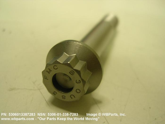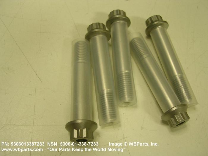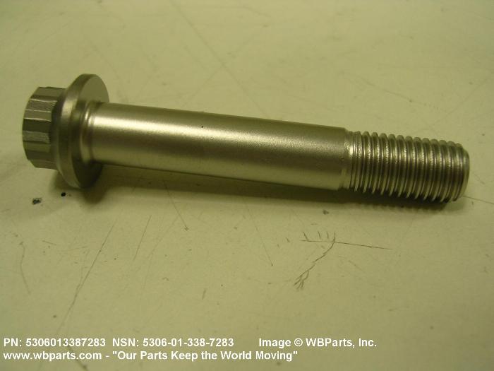 5306-01-338-7283 A high strength, 160,000 pounds per square inch (1100 megapascals) minimum tensile strength externally threaded fastener designed for use in applications involving great shear stress. The head is designed to accommodate an external wrench or driver. The head is not designed to be held or driven with an inserted driver, nor is it designed for rotation by the thumb and fingers. The unthreaded portion is of specific grip length, plated or unplated, and is machined to a tolerance of one thousandth (0.001) of an inch (0.025 mm) or less of a specific diameter for items one inch (25 mm) or less in diameter. Items over one inch (25 mm) in diameter shall have a tolerance of fifteen ten thousandths (0.0015) of an inch (0.038 mm) or less. The nominal major diameter of the threads shall be at least one thousandth (0.001) of an inch (0.025 mm) below the minimum shank diameter, but not below the minimum major diameter for applicable class of fit, as shown in the Screw Thread Standards, FED STD H28 and/or other nationally recognized standards. A locking feature may be incorporated in the design of the head or threads. See BOLT, MACHINE and BOLT, CLEVIS.
