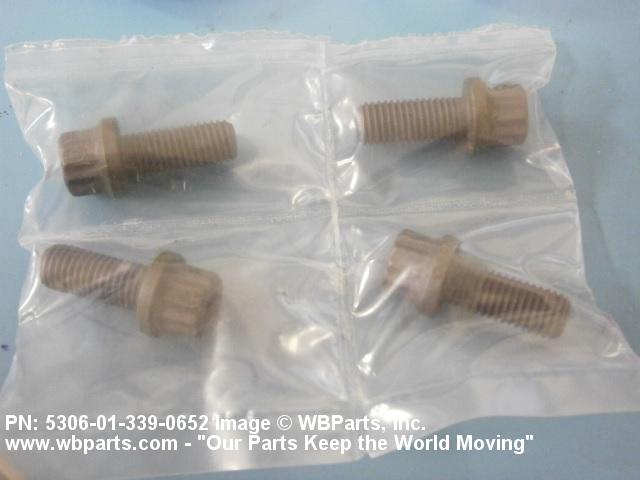 5306-01-339-0652 An externally threaded fastener designed for insertion through holes in assembled parts and normally intended to be tightened or released by torquing a nut. The threaded and unthreaded portions are both of one nominal diameter of 0.190 inch (5 mm) or larger. The head is not designed to be held or driven with an inserted driver or by the thumb and fingers. A locking feature may be incorporated in the design of the head or threads. Head dimensions and sizes of threaded and unthreaded portions shall conform to internationally recognized fastener standards. For items having a grip length portion machined to a tolerance of 0.0015 inch (0.038 mm) or less, BOLT, SHEAR. See also SCREW, CAP, HEXAGON HEAD and SCREW, MACHINE.