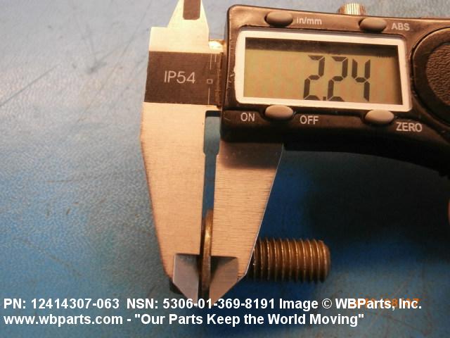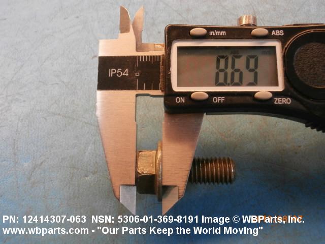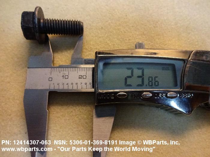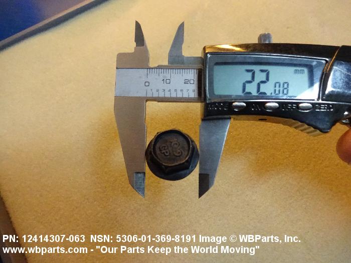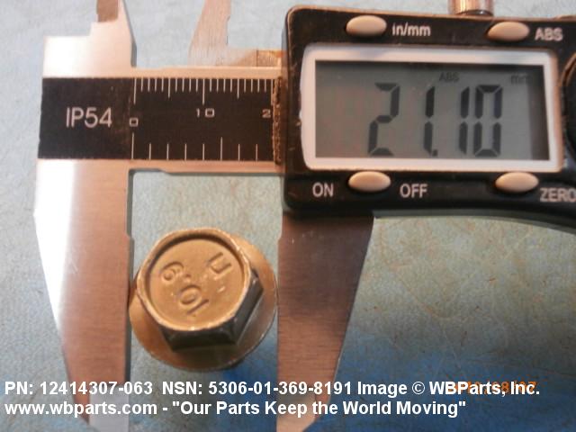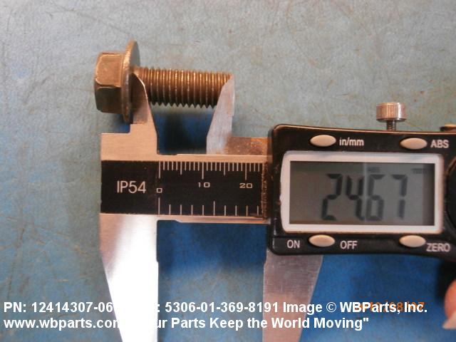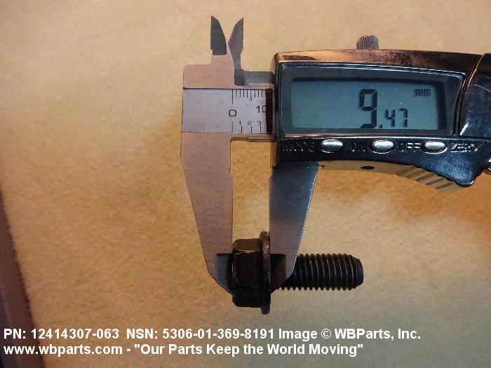 5306-01-369-8191 An externally threaded fastener designed for insertion through holes in assembled parts and normally intended to be tightened or released by torquing a nut. The threaded and unthreaded portions are both of one nominal diameter of 0.190 inch (5 mm) or larger. The head is not designed to be held or driven with an inserted driver or by the thumb and fingers. A locking feature may be incorporated in the design of the head or threads. Head dimensions and sizes of threaded and unthreaded portions shall conform to internationally recognized fastener standards. For items having a grip length portion machined to a tolerance of 0.0015 inch (0.038 mm) or less, BOLT, SHEAR. See also SCREW, CAP, HEXAGON HEAD and SCREW, MACHINE.