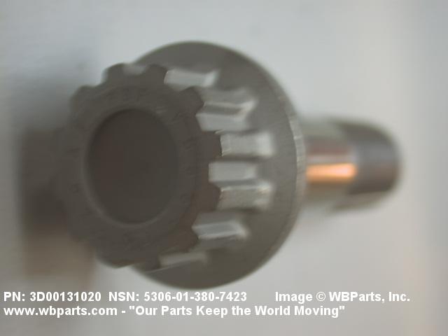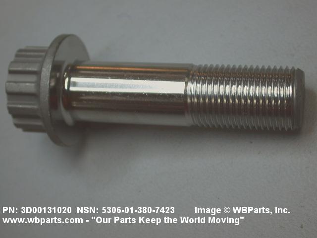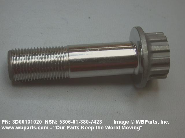 5306-01-380-7423 A high strength, 160,000 pounds per square inch (1100 megapascals) minimum tensile strength externally threaded fastener designed for use in applications involving great shear stress. The head is designed to accommodate an external wrench or driver. The head is not designed to be held or driven with an inserted driver, nor is it designed for rotation by the thumb and fingers. The unthreaded portion is of specific grip length, plated or unplated, and is machined to a tolerance of one thousandth (0.001) of an inch (0.025 mm) or less of a specific diameter for items one inch (25 mm) or less in diameter. Items over one inch (25 mm) in diameter shall have a tolerance of fifteen ten thousandths (0.0015) of an inch (0.038 mm) or less. The nominal major diameter of the threads shall be at least one thousandth (0.001) of an inch (0.025 mm) below the minimum shank diameter, but not below the minimum major diameter for applicable class of fit, as shown in the Screw Thread Standards, FED STD H28 and/or other nationally recognized standards. A locking feature may be incorporated in the design of the head or threads. See BOLT, MACHINE and BOLT, CLEVIS.