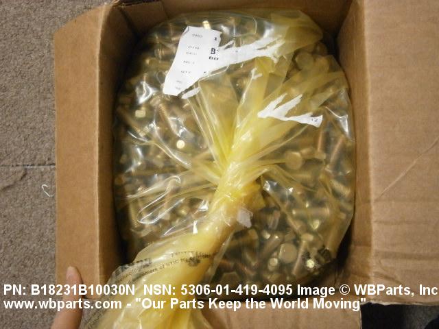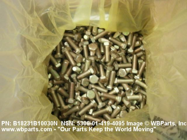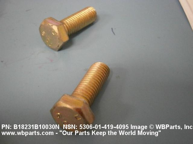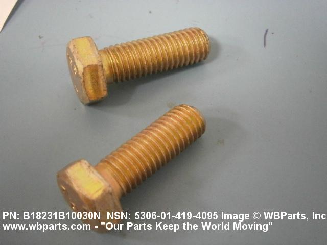 5306-01-419-4095 An externally threaded fastener designed for insertion through holes in assembled parts and normally intended to be tightened or released by torquing a nut. The threaded and unthreaded portions are both of one nominal diameter of 0.190 inch (5 mm) or larger. The head is not designed to be held or driven with an inserted driver or by the thumb and fingers. A locking feature may be incorporated in the design of the head or threads. Head dimensions and sizes of threaded and unthreaded portions shall conform to internationally recognized fastener standards. For items having a grip length portion machined to a tolerance of 0.0015 inch (0.038 mm) or less, BOLT, SHEAR. See also SCREW, CAP, HEXAGON HEAD and SCREW, MACHINE.