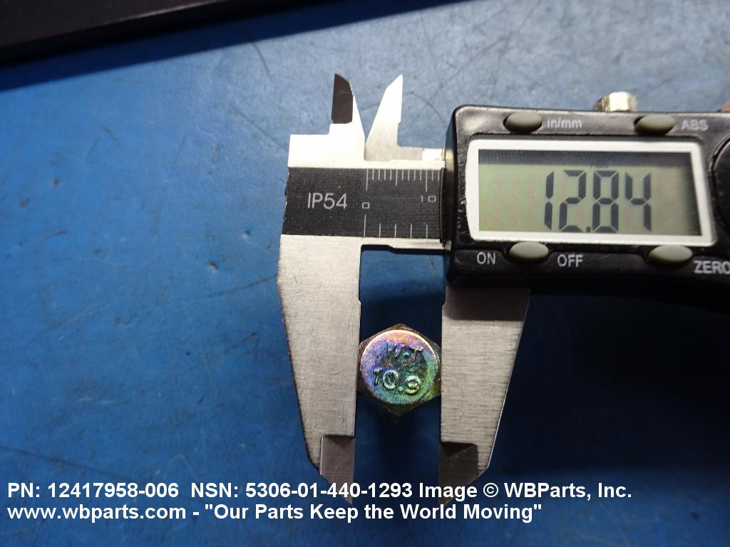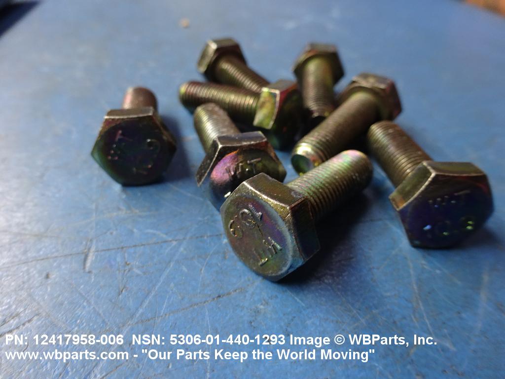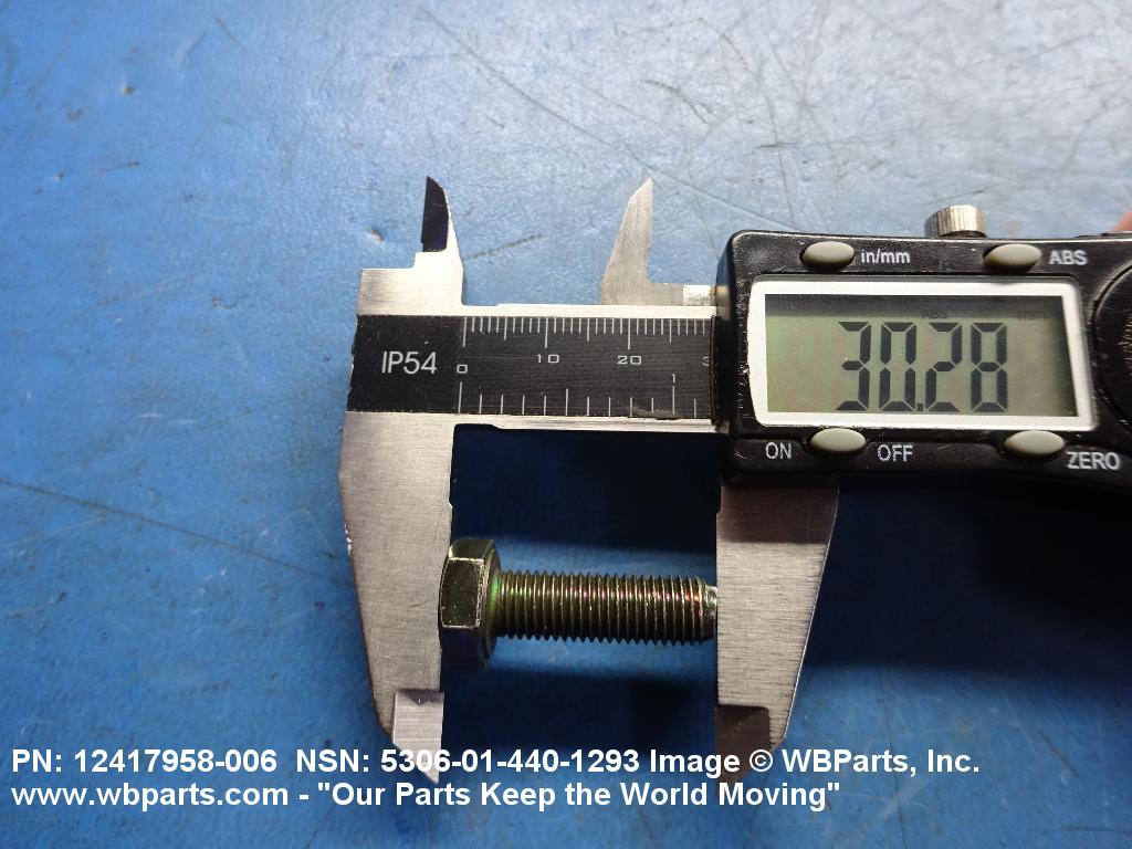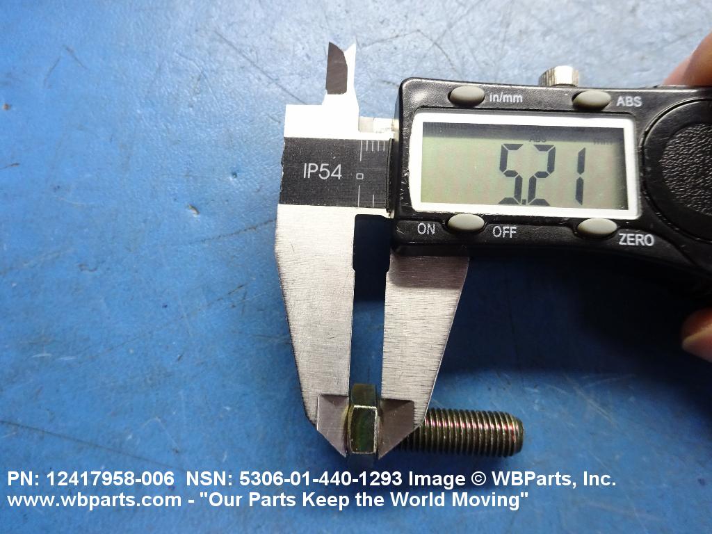 5306-01-440-1293 An externally threaded fastener designed for insertion through holes in assembled parts and normally intended to be tightened or released by torquing a nut. The threaded and unthreaded portions are both of one nominal diameter of 0.190 inch (5 mm) or larger. The head is not designed to be held or driven with an inserted driver or by the thumb and fingers. A locking feature may be incorporated in the design of the head or threads. Head dimensions and sizes of threaded and unthreaded portions shall conform to internationally recognized fastener standards. For items having a grip length portion machined to a tolerance of 0.0015 inch (0.038 mm) or less, BOLT, SHEAR. See also SCREW, CAP, HEXAGON HEAD and SCREW, MACHINE.