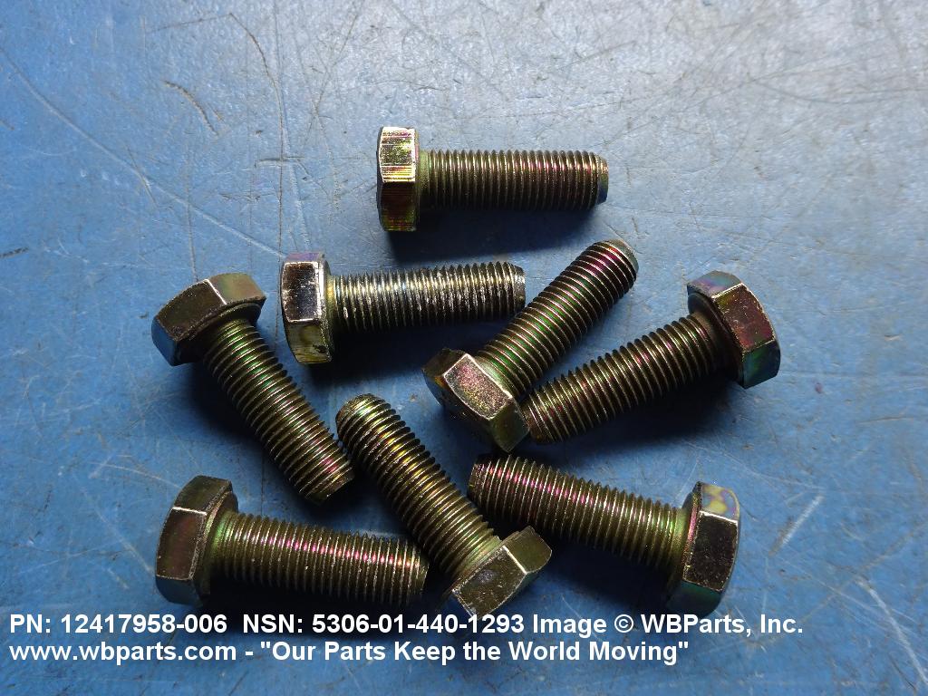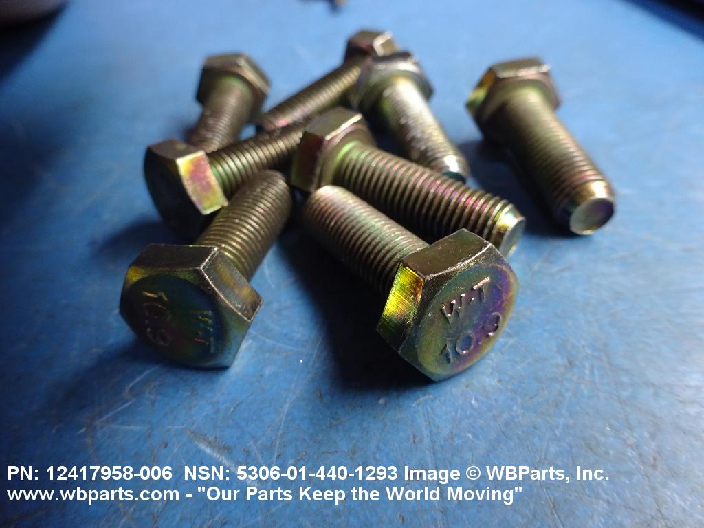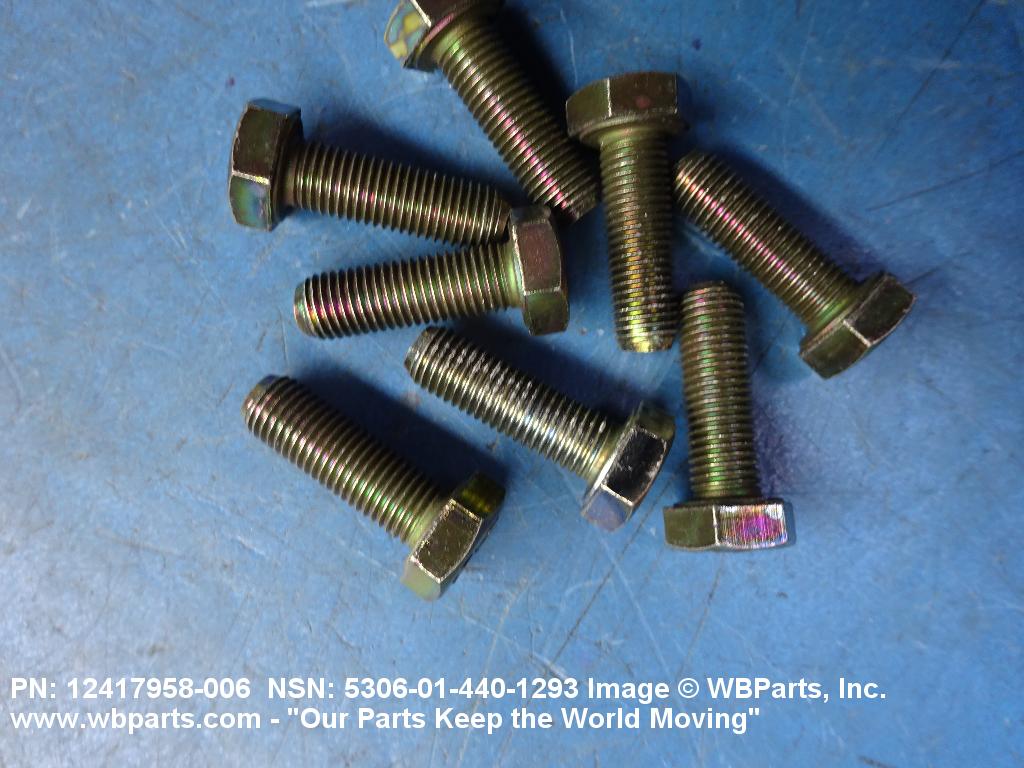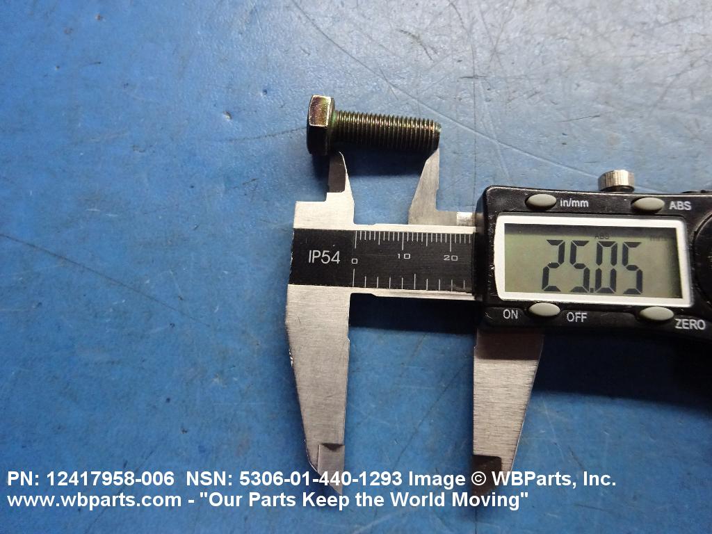 5306-01-440-1293 An externally threaded fastener designed for insertion through holes in assembled parts and normally intended to be tightened or released by torquing a nut. The threaded and unthreaded portions are both of one nominal diameter of 0.190 inch (5 mm) or larger. The head is not designed to be held or driven with an inserted driver or by the thumb and fingers. A locking feature may be incorporated in the design of the head or threads. Head dimensions and sizes of threaded and unthreaded portions shall conform to internationally recognized fastener standards. For items having a grip length portion machined to a tolerance of 0.0015 inch (0.038 mm) or less, BOLT, SHEAR. See also SCREW, CAP, HEXAGON HEAD and SCREW, MACHINE.