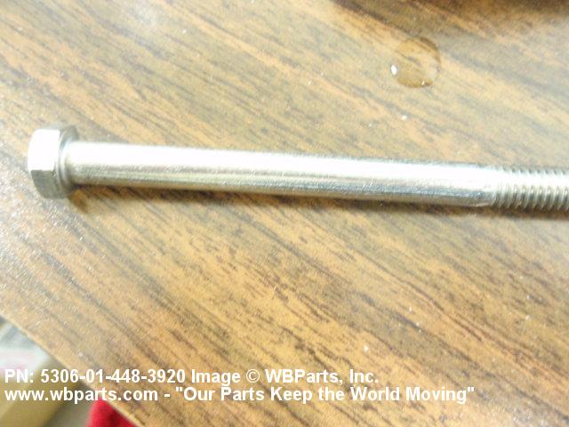 5306-01-448-3920 An externally threaded fastener designed for insertion through holes in assembled parts and normally intended to be tightened or released by torquing a nut. The threaded and unthreaded portions are both of one nominal diameter of 0.190 inch (5 mm) or larger. The head is not designed to be held or driven with an inserted driver or by the thumb and fingers. A locking feature may be incorporated in the design of the head or threads. Head dimensions and sizes of threaded and unthreaded portions shall conform to internationally recognized fastener standards. For items having a grip length portion machined to a tolerance of 0.0015 inch (0.038 mm) or less, BOLT, SHEAR. See also SCREW, CAP, HEXAGON HEAD and SCREW, MACHINE.